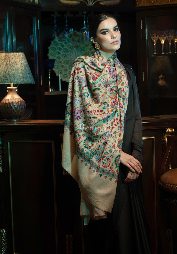 Pashtush womens Fine Wool shawl, Kalamkari design, Beige