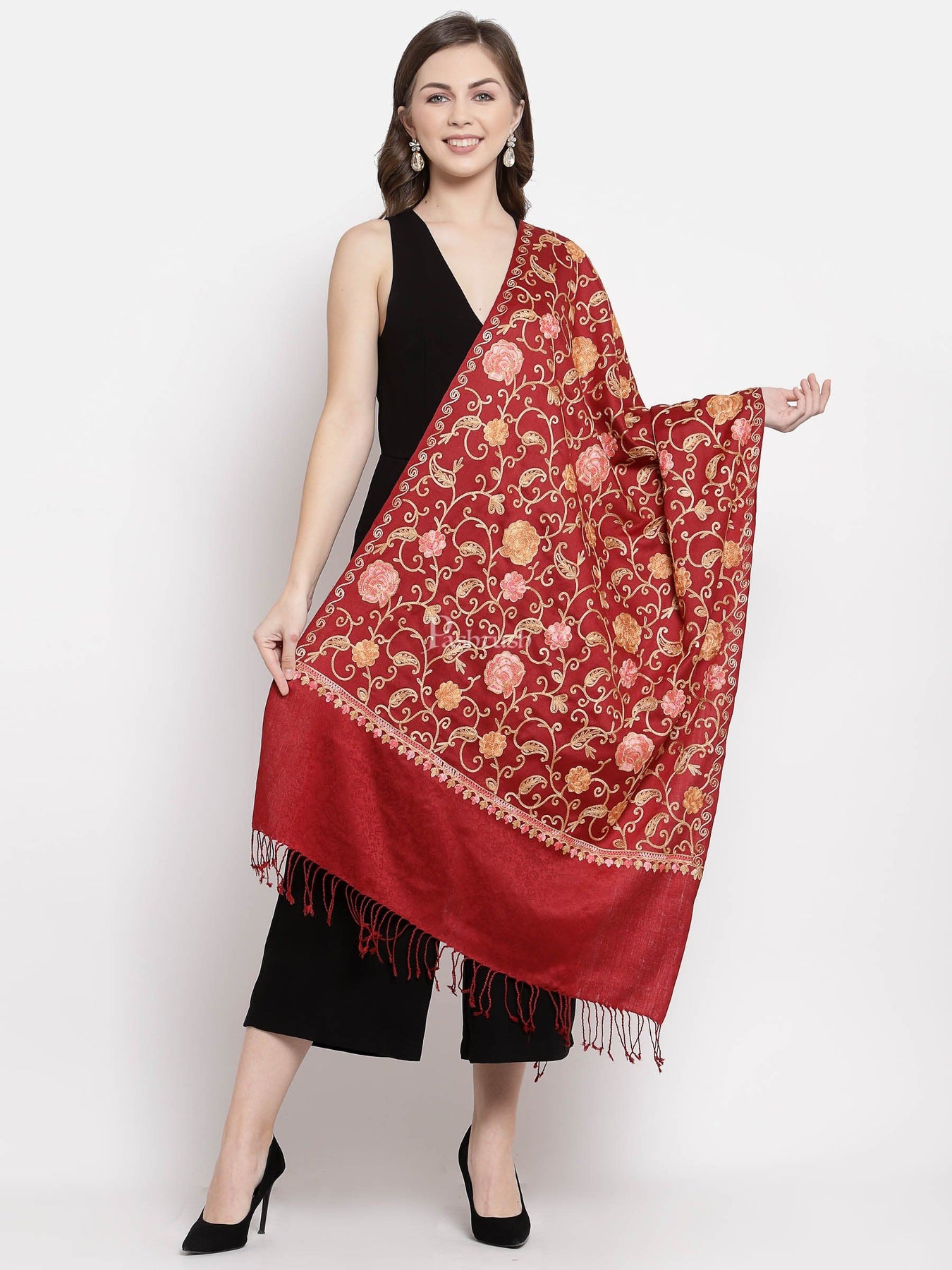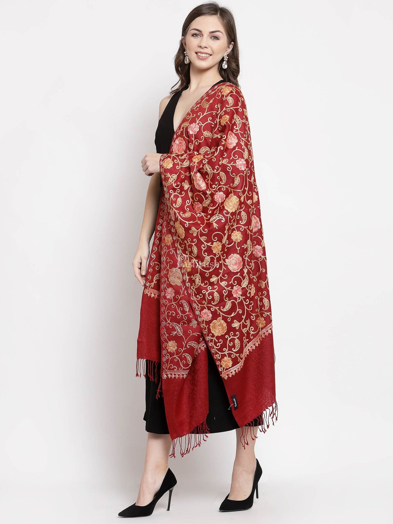 Pashtush Aari Embroidery Stole, Fine Wool, Maroon