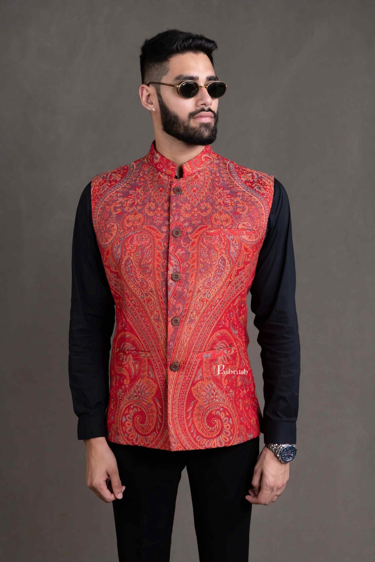 Make a bold statement with our Pashtush Men's Woven Jacquard Waistcoat in a striking shade of red. The structured slim fit adds a contemporary and refined touch to your formal ensemble. Meticulously crafted with a woven jacquard design, this waistcoat exudes sophistication and attention to detail. Elevate your style with this vibrant piece that seamlessly blends tradition with modernity. Immerse yourself in the luxury of Kashmiri design aesthetics, reflecting the rich cultural heritage with every wear. Redefine your formal look with this exquisite waistcoat, perfect for the discerning gentleman who values both style and substance.