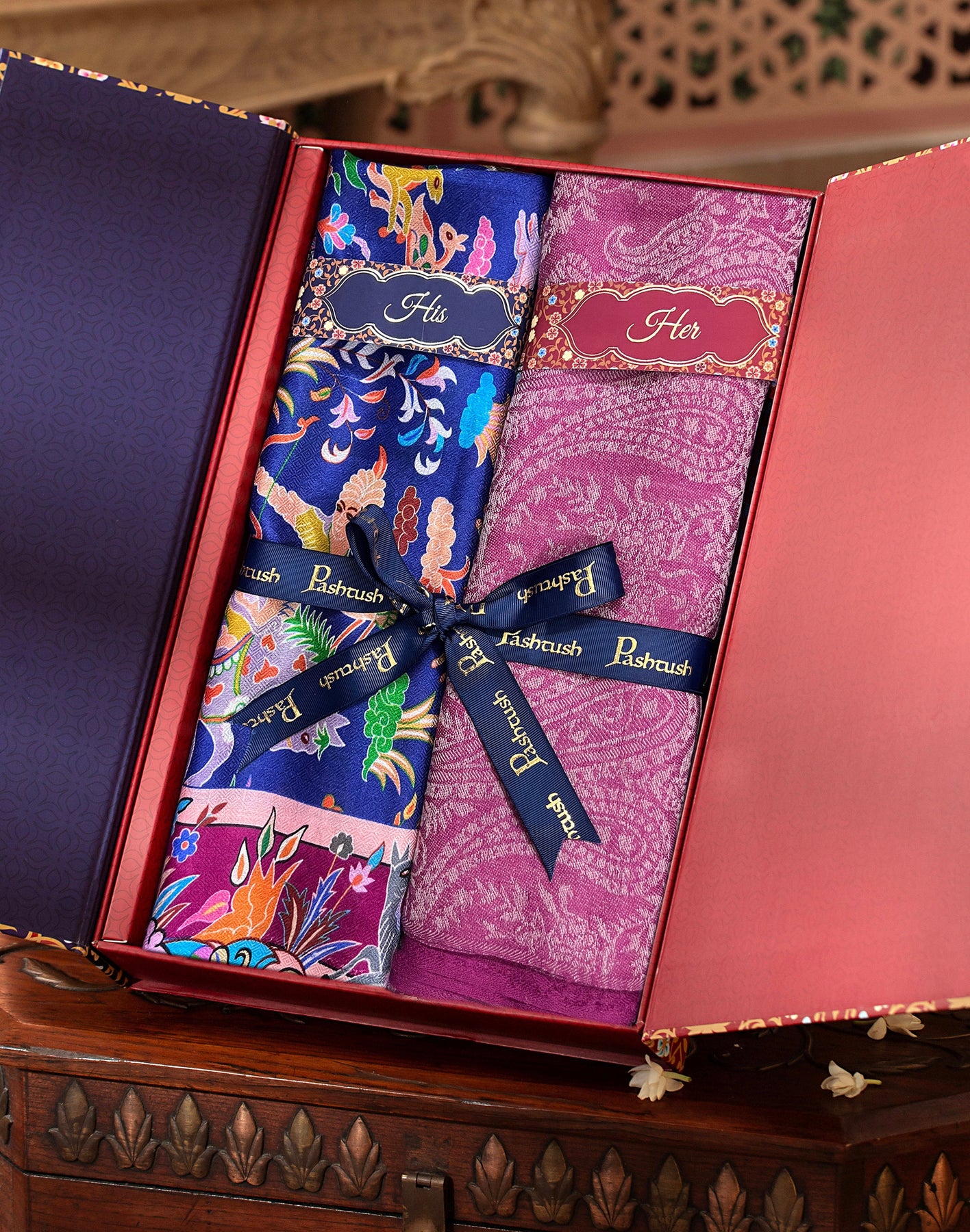Pashtush India Gift Pack Pashtush His And Her Set Of Fine Wool Stoles, Premium Gift Box Packaging, Beige and Pink