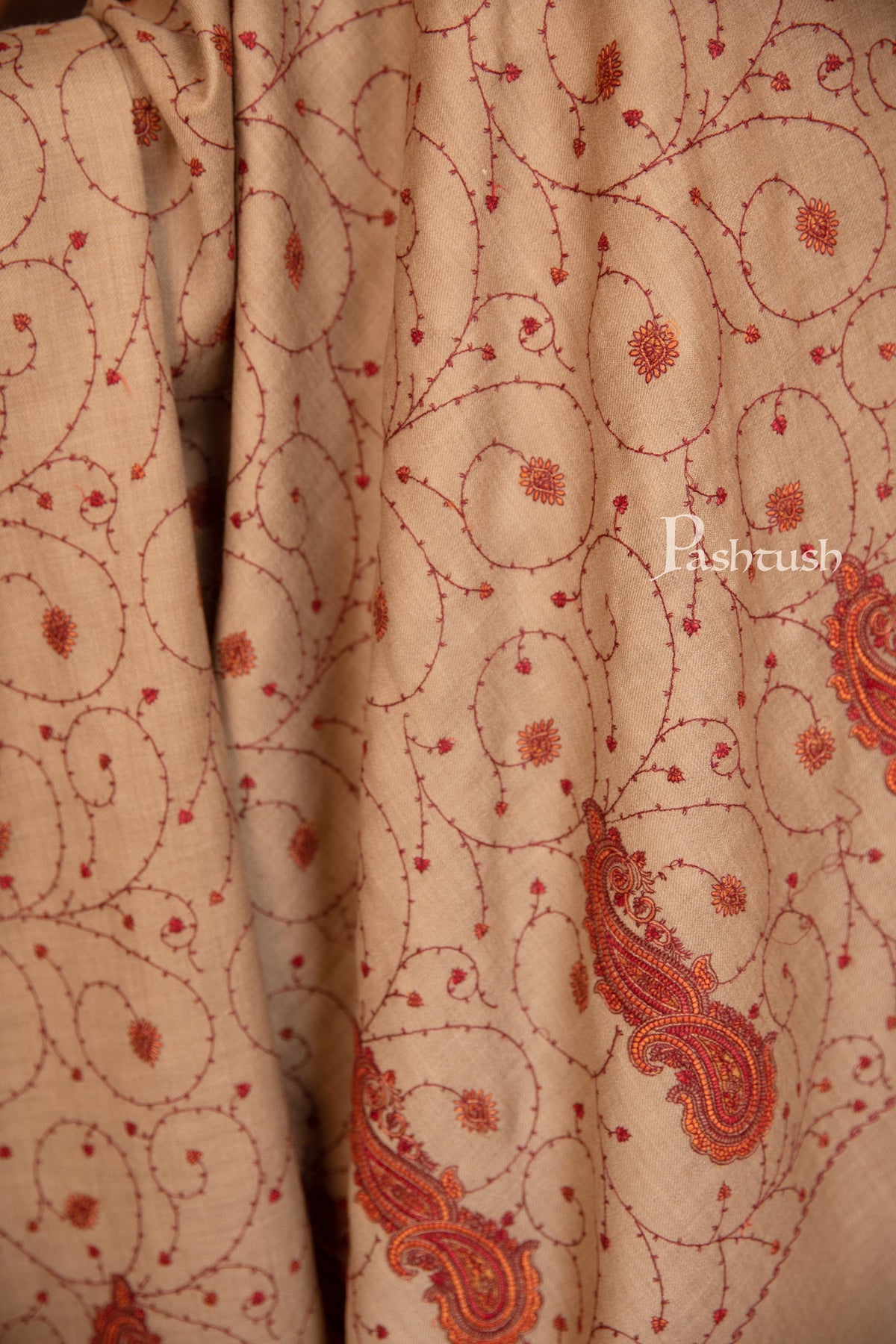 Pashtush Womens Fine Wool Shawl, Heavy Jaal Embroidery Design, Beige