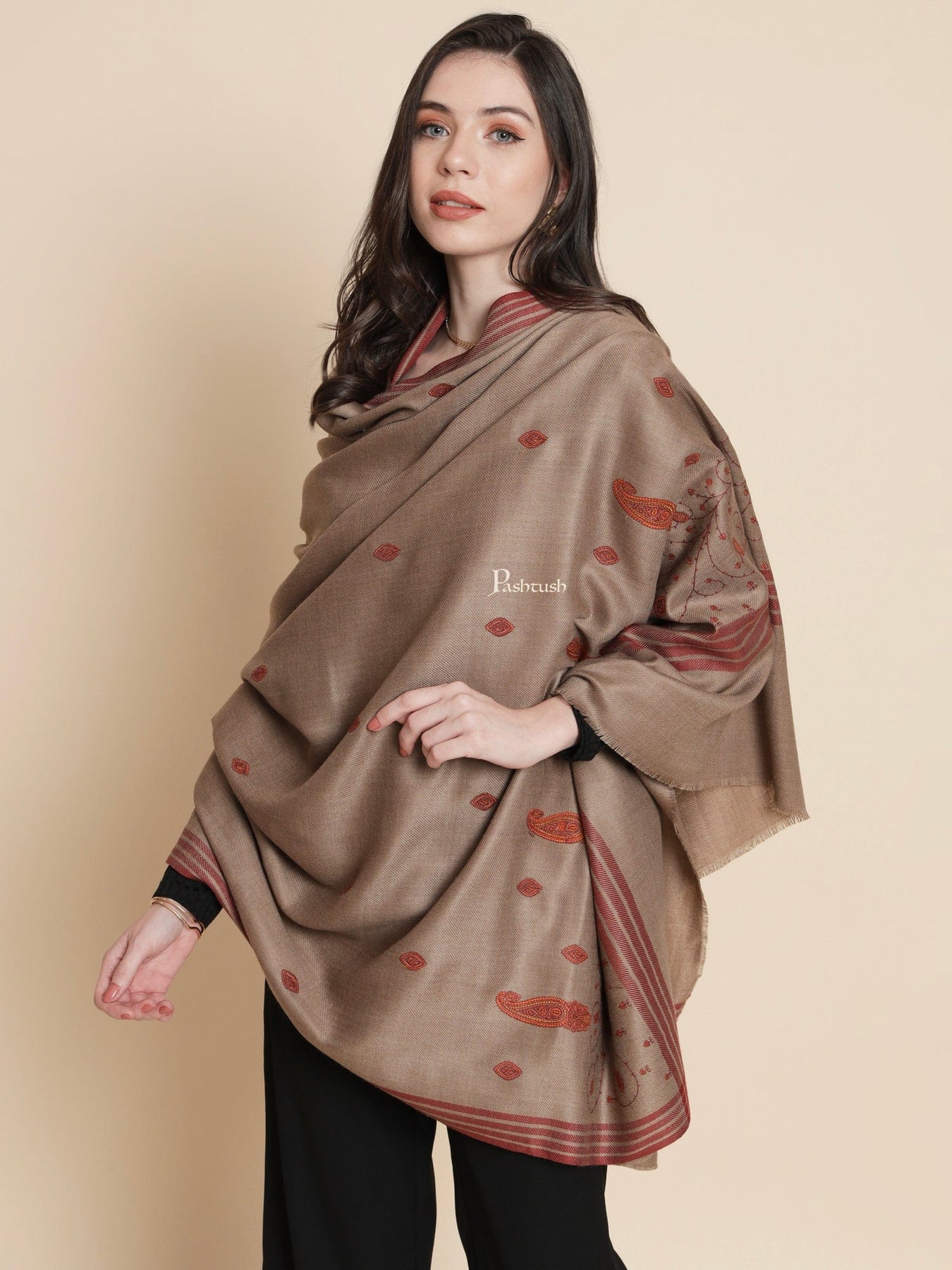 Indulge in the richness of Kashmiri embroidery with Pashtush Women's Woollen Shawl in Brown. This exceptional piece features a paisley large thick and warm design with intricate Kashmiri embroidery, showcasing the artistry and craftsmanship of the region. The warm and cozy woollen fabric provides both comfort and style, making it a perfect accessory for colder seasons., Pashtush collections are carefully curated keeping in mind the rich traditional heritage of Indian Arts. Each piece is meticulously designed to alchemise tradition in a way that it finds a well deserved place in any modern wardrobe.