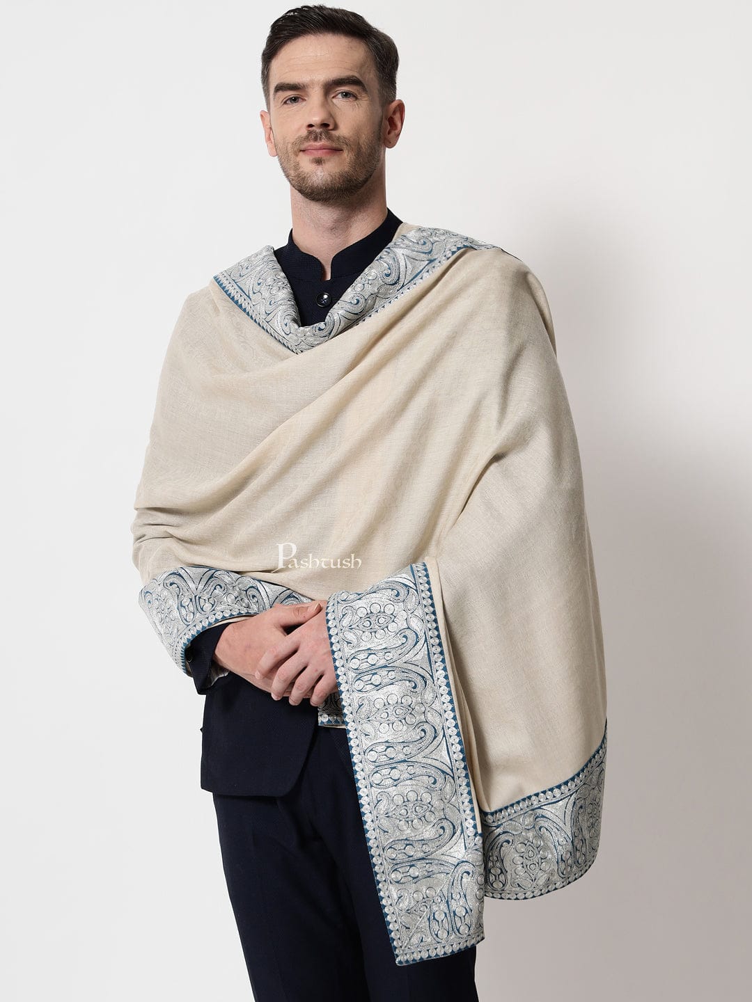 Pashtush India Mens Shawls Gents Shawl Pashtush mens 100% Pure Wool with Woolmark Certificate shawl, Metallic Tilla border weave design, Beige