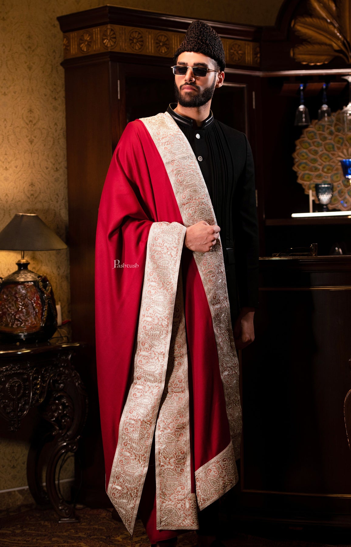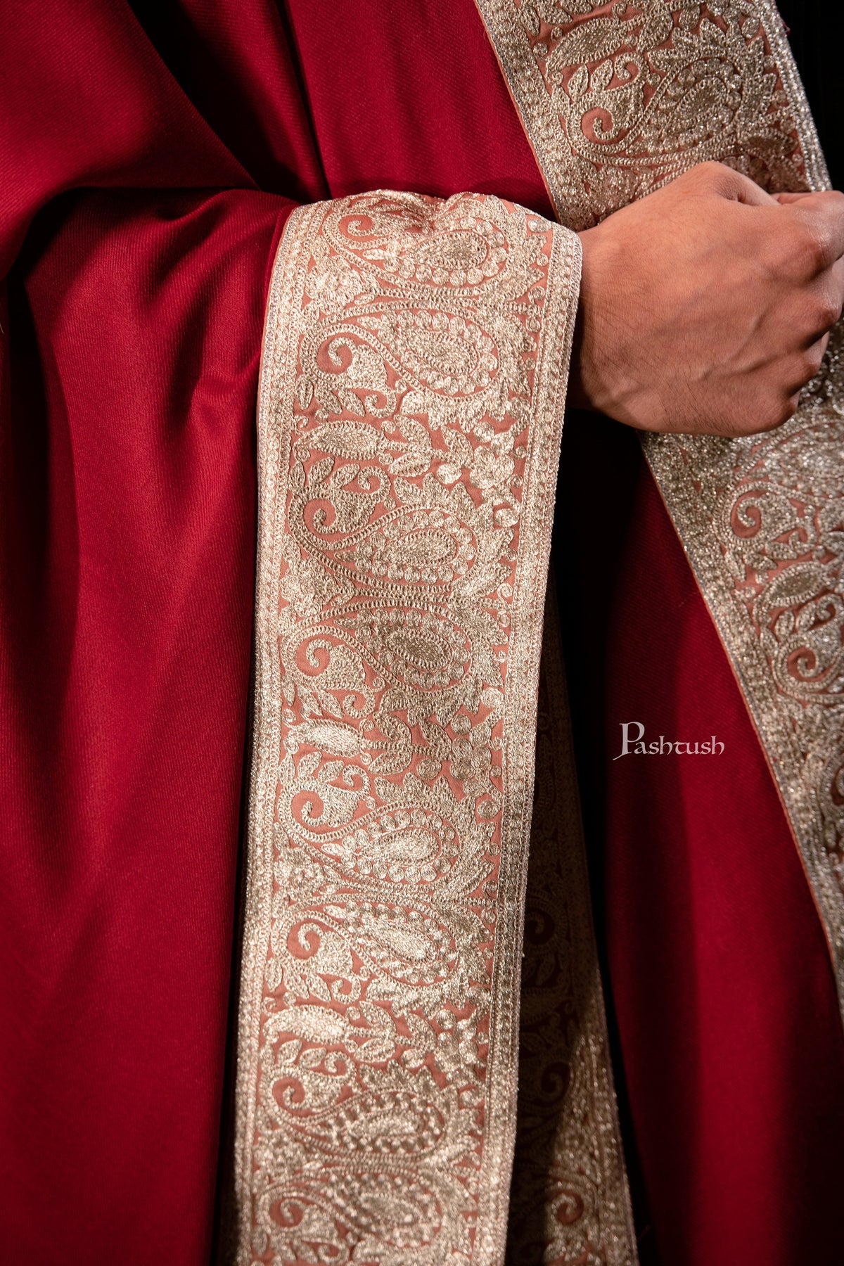Pashtush mens 100% Pure Wool with Woolmark Certificate shawl, Metallic Tilla silver border weave design, Maroon