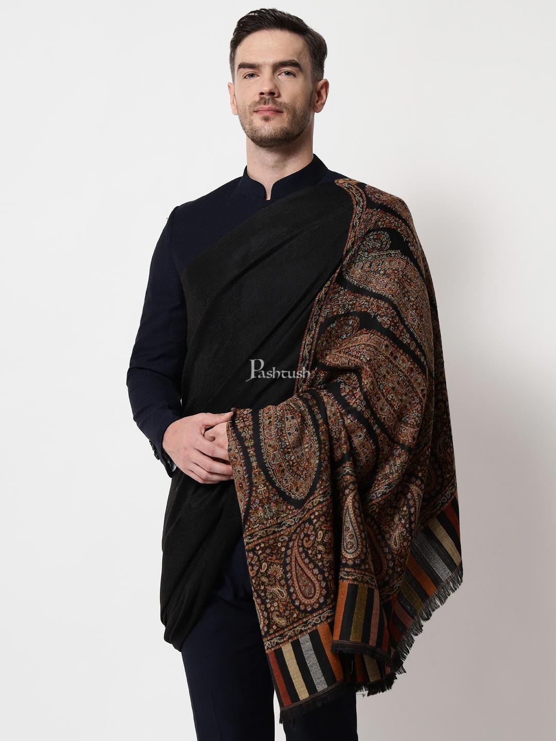Pashtush Mens Fine Wool Shawl, Royal Collection, Palle-Dar Shawl, With Antique Jama Palla, Black, Full Size
