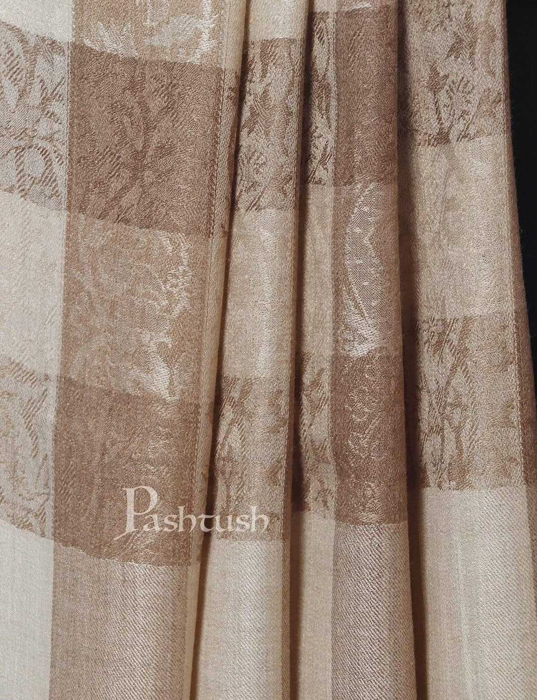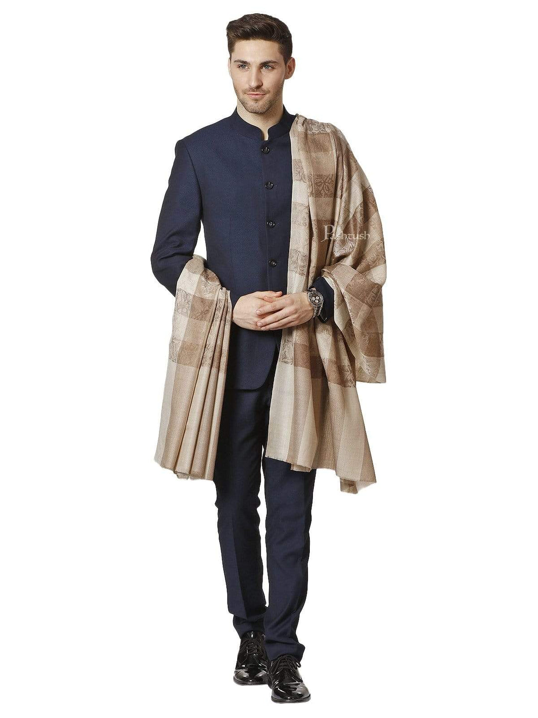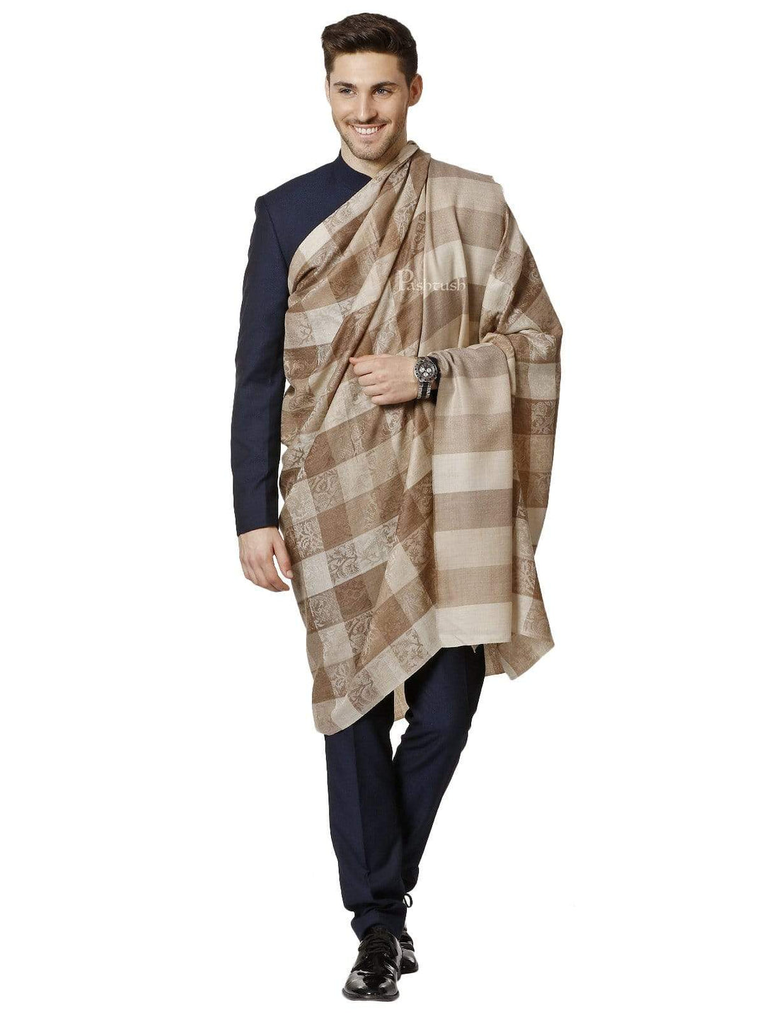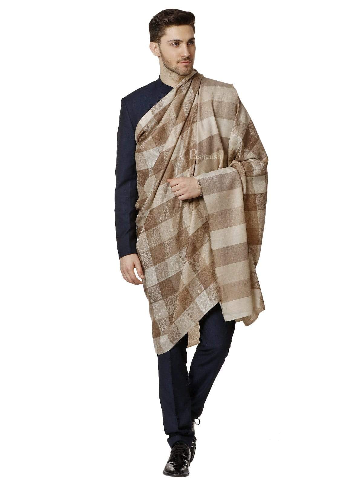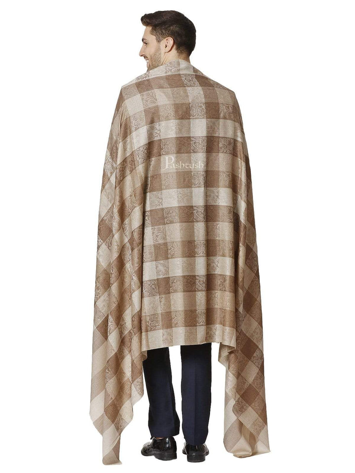 Pashtush Mens Checkered Shawl, Natural Beige, Fine Wool, Medium