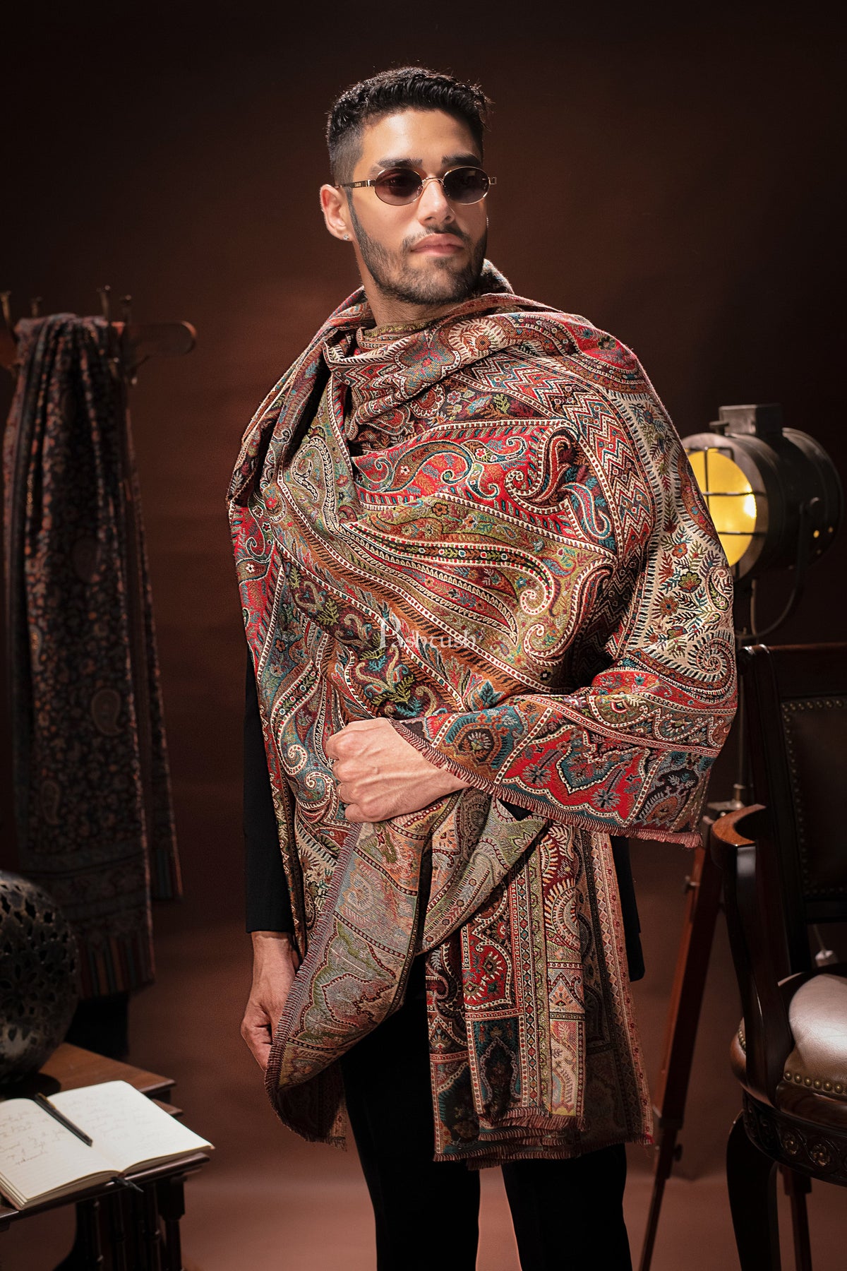 Pashtush Mens Reversible Stole, Faux Pashmina, Woven Antique Heritage Design, Jamawar