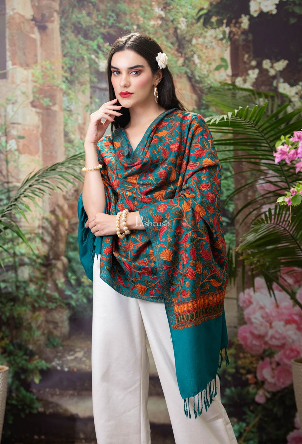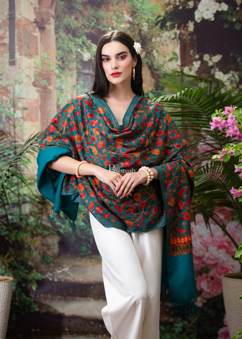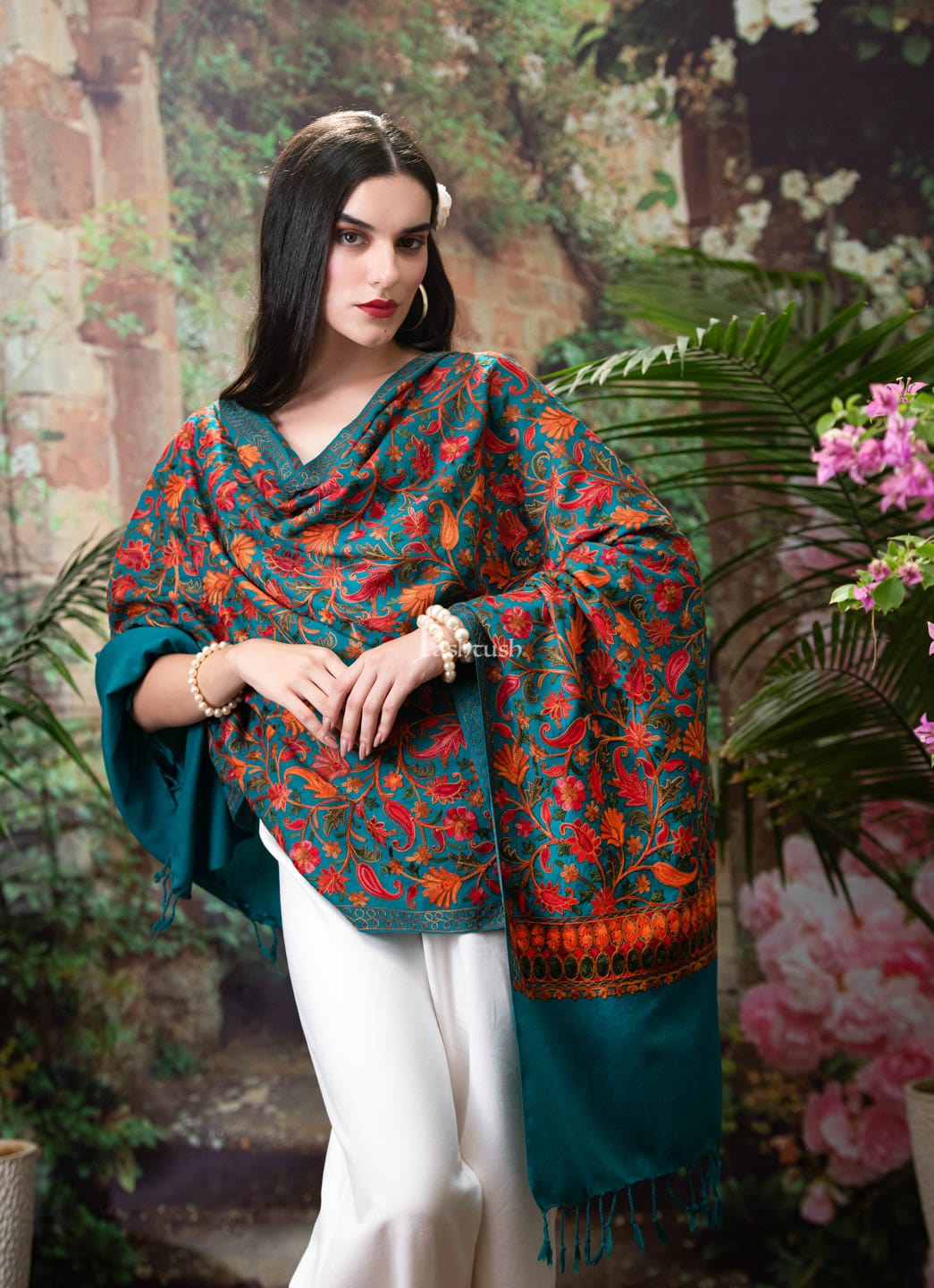 Pashtush womens Faux Pashmina stole, Aari embroidery design, Arabic Sea green