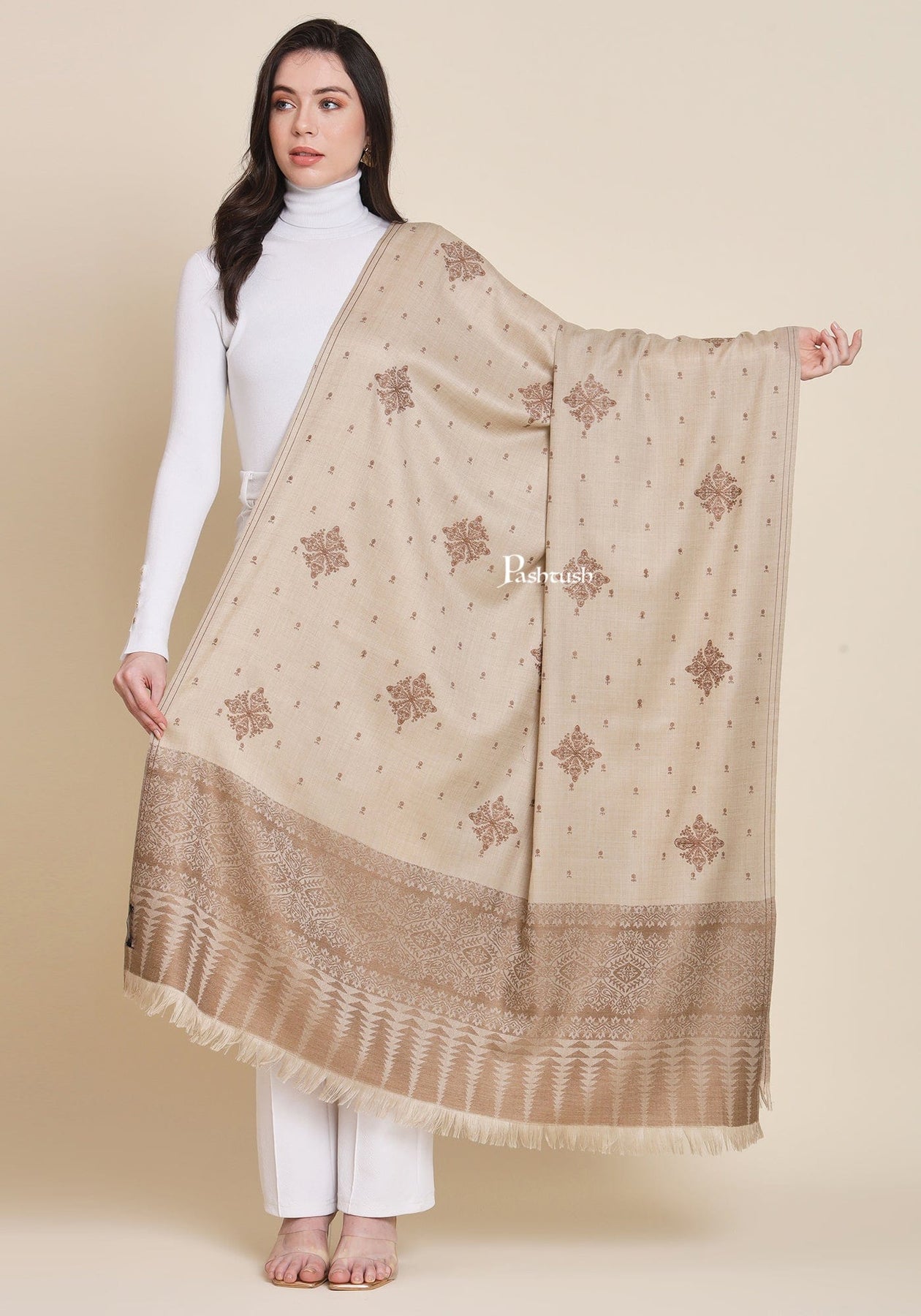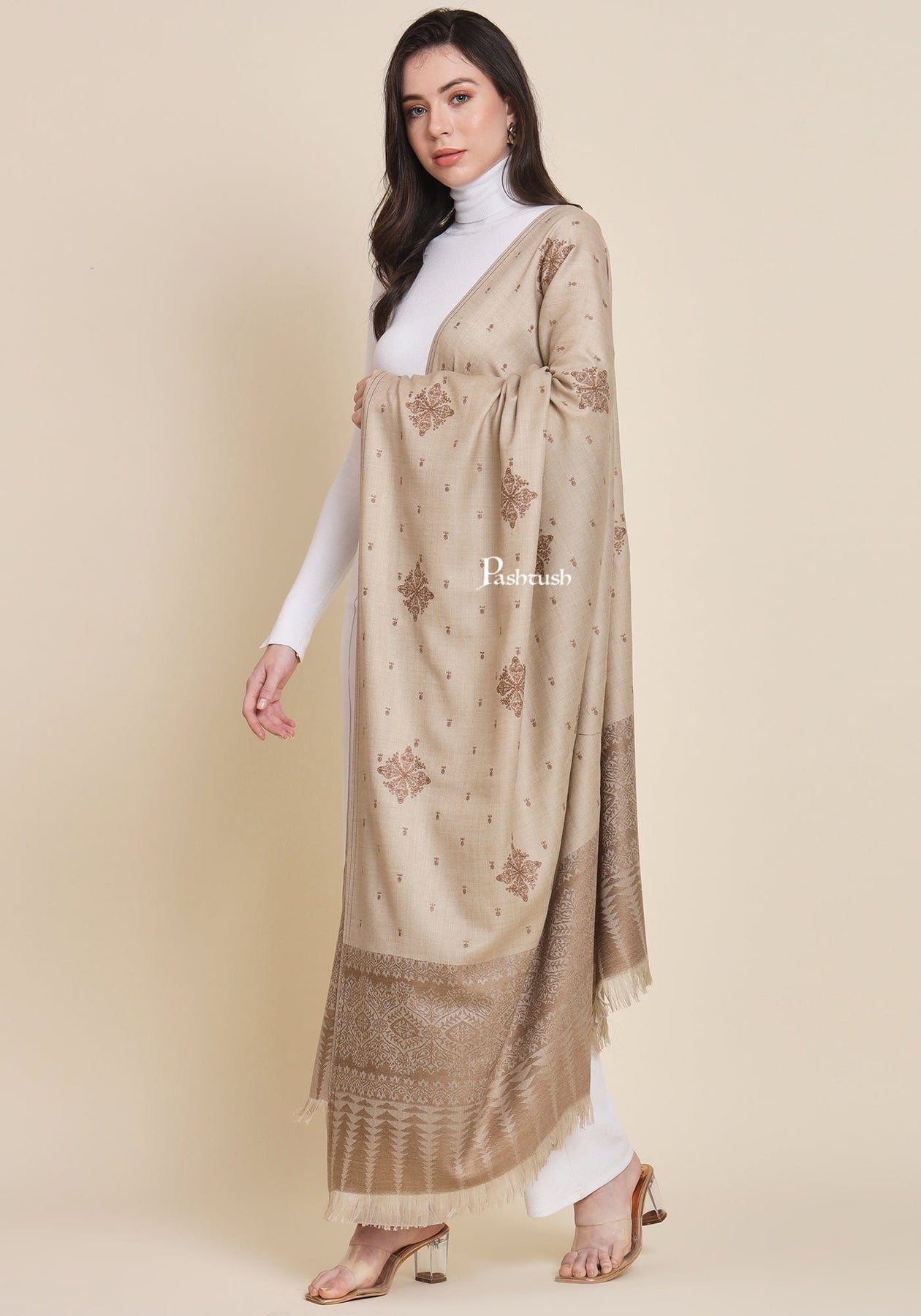 Pashtush Womens Fine Wool Shawl, Design, Beige