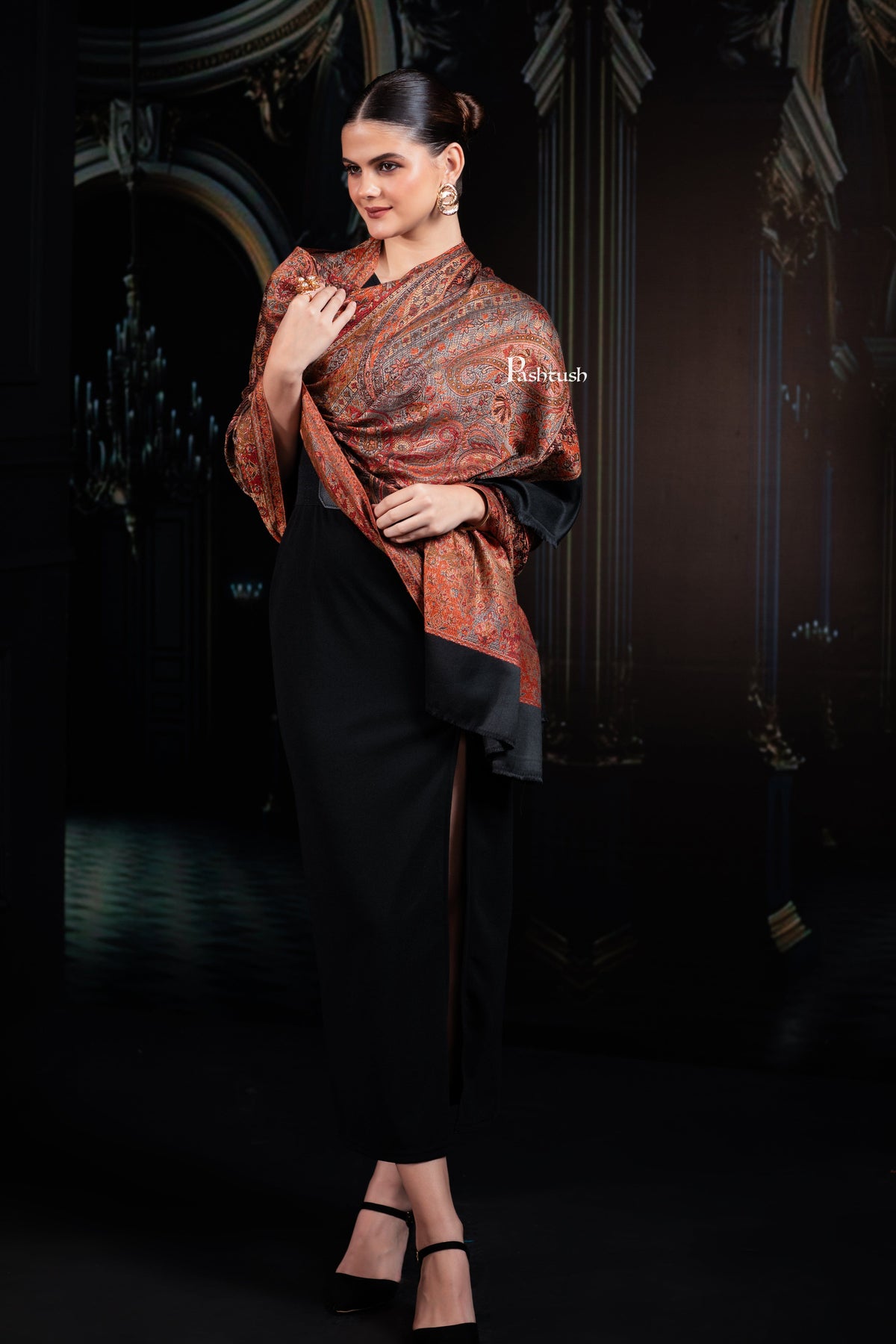 Pashtush Womens Jamawar Shawl, Ethnic Paisley Design, Black
