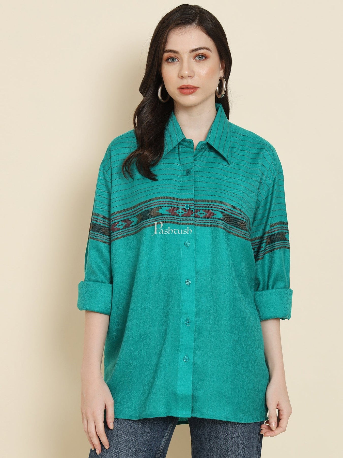 Pashtush India Womens Shirt Pashtush Womens Oversized Casual Woollen Shirt, Sea Green