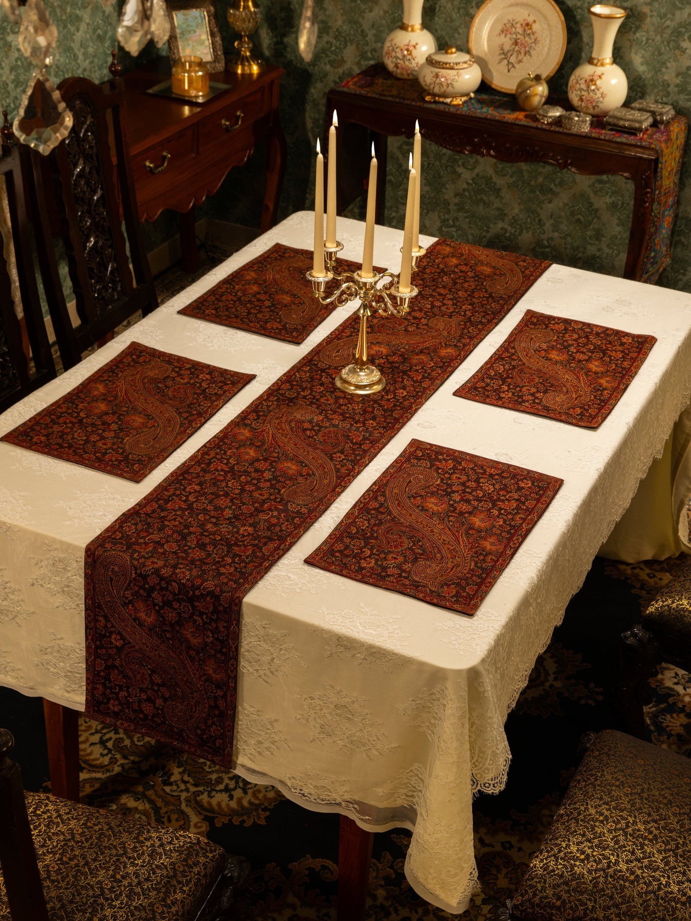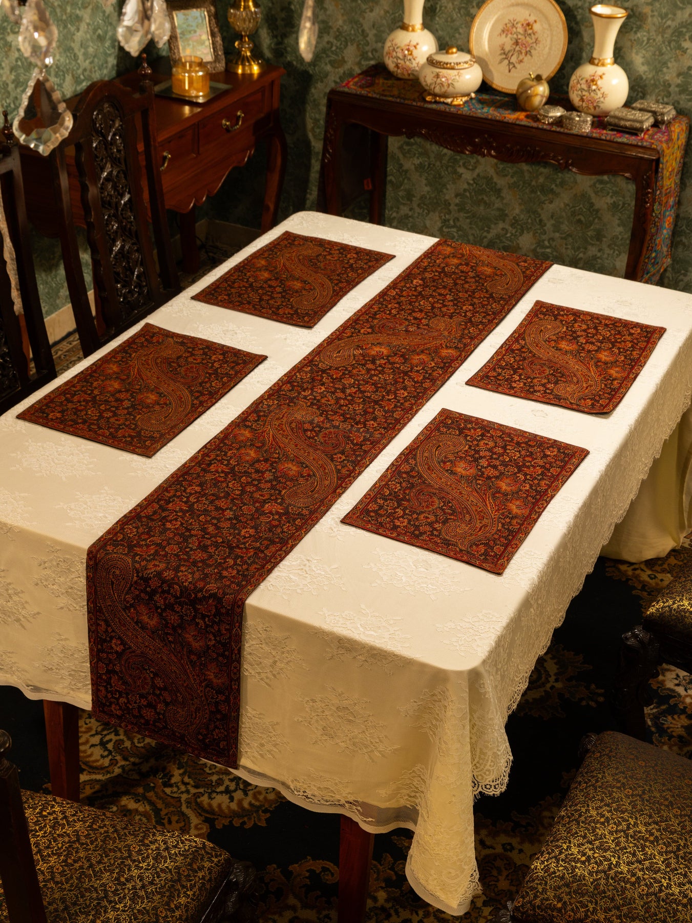 Pashtush Luxury Table Runner with Mats Set, Jamawar Collection, Espresso Brown