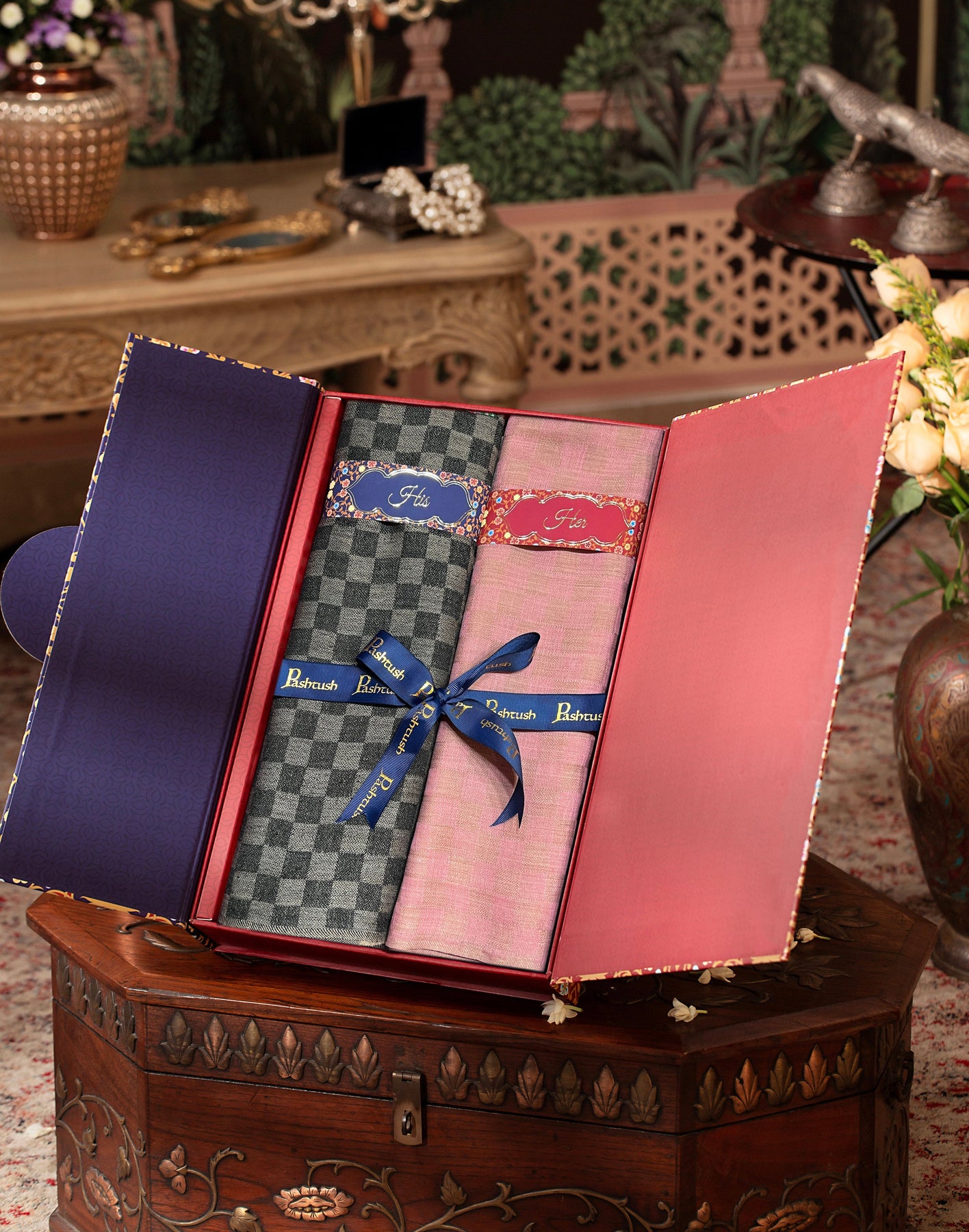 Pashtush His And Her Set Of Fine Wool Checkerd Stoles, Premium Gift Box Packaging, Black & Powder Pink