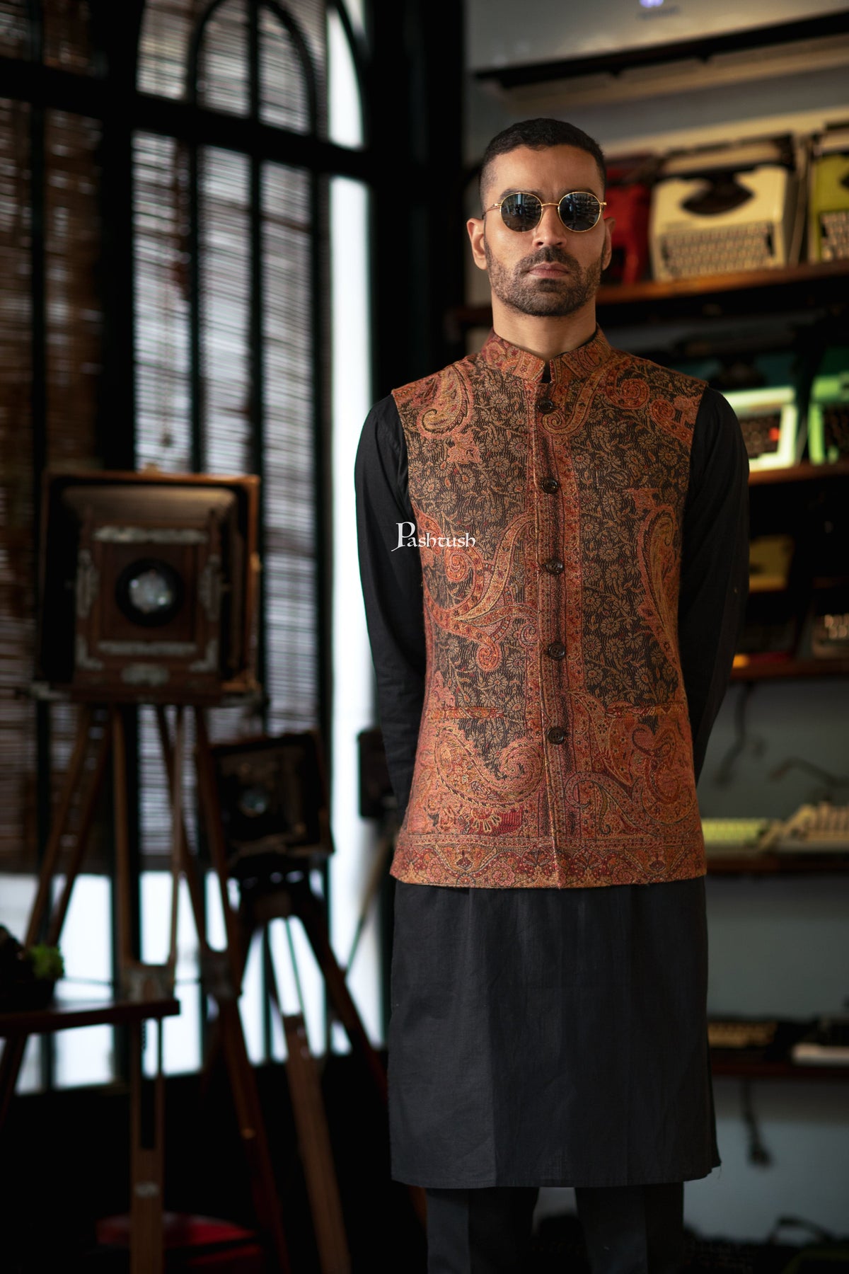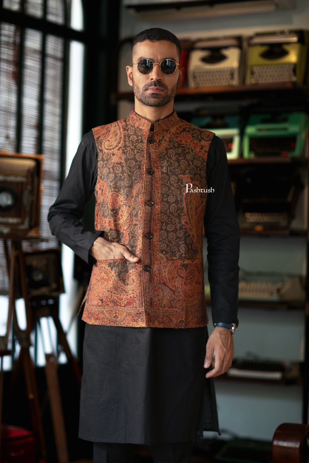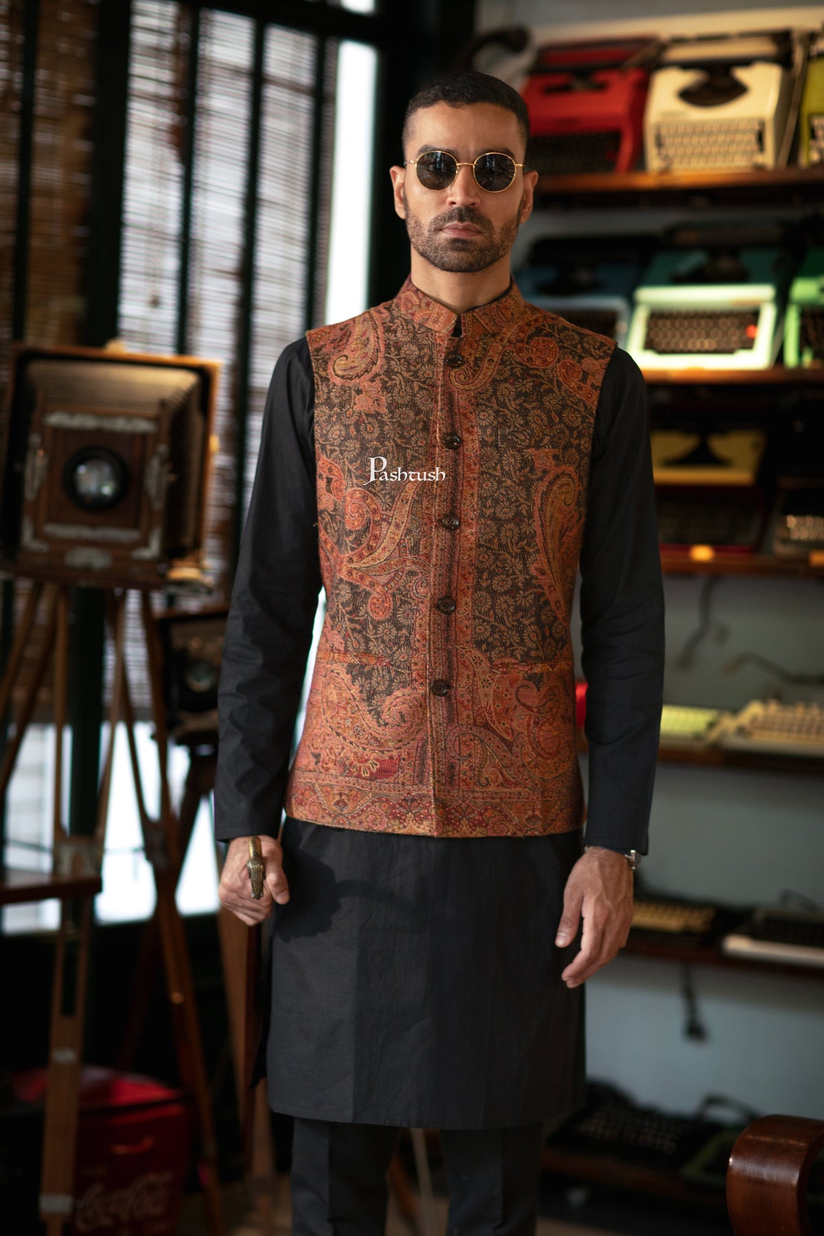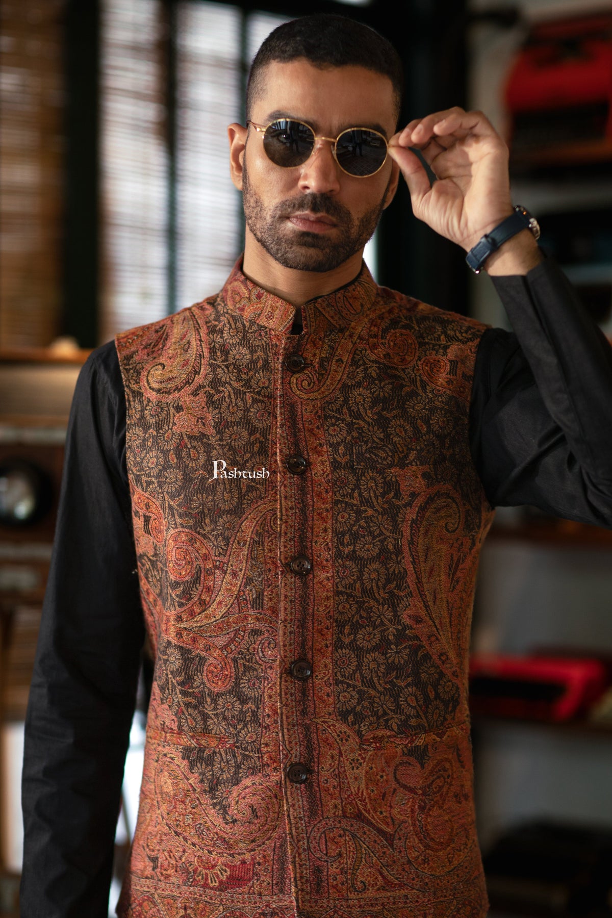 Pashtush Mens Woven Jacquard Structured Waistcoat, Slim Fit, Black and Beige