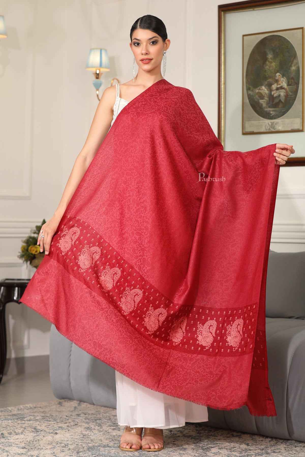 Pashtush Womens Extra Fine Wool Shawl, Tone On Tone Embroidery Design, red