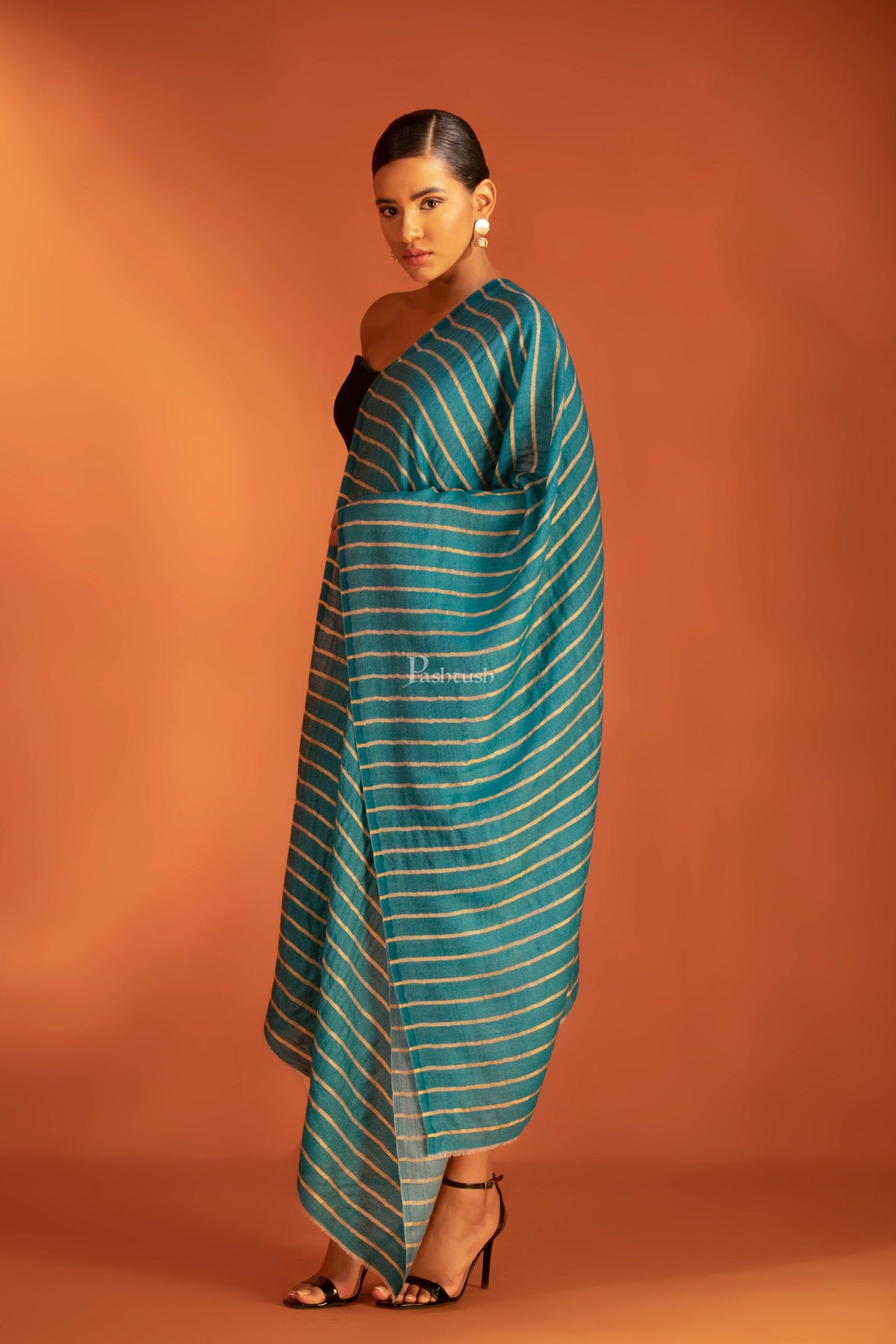 Pashtush Twilight Stole, With Woven Metallic Thread, Silk Wool, Blue and gold