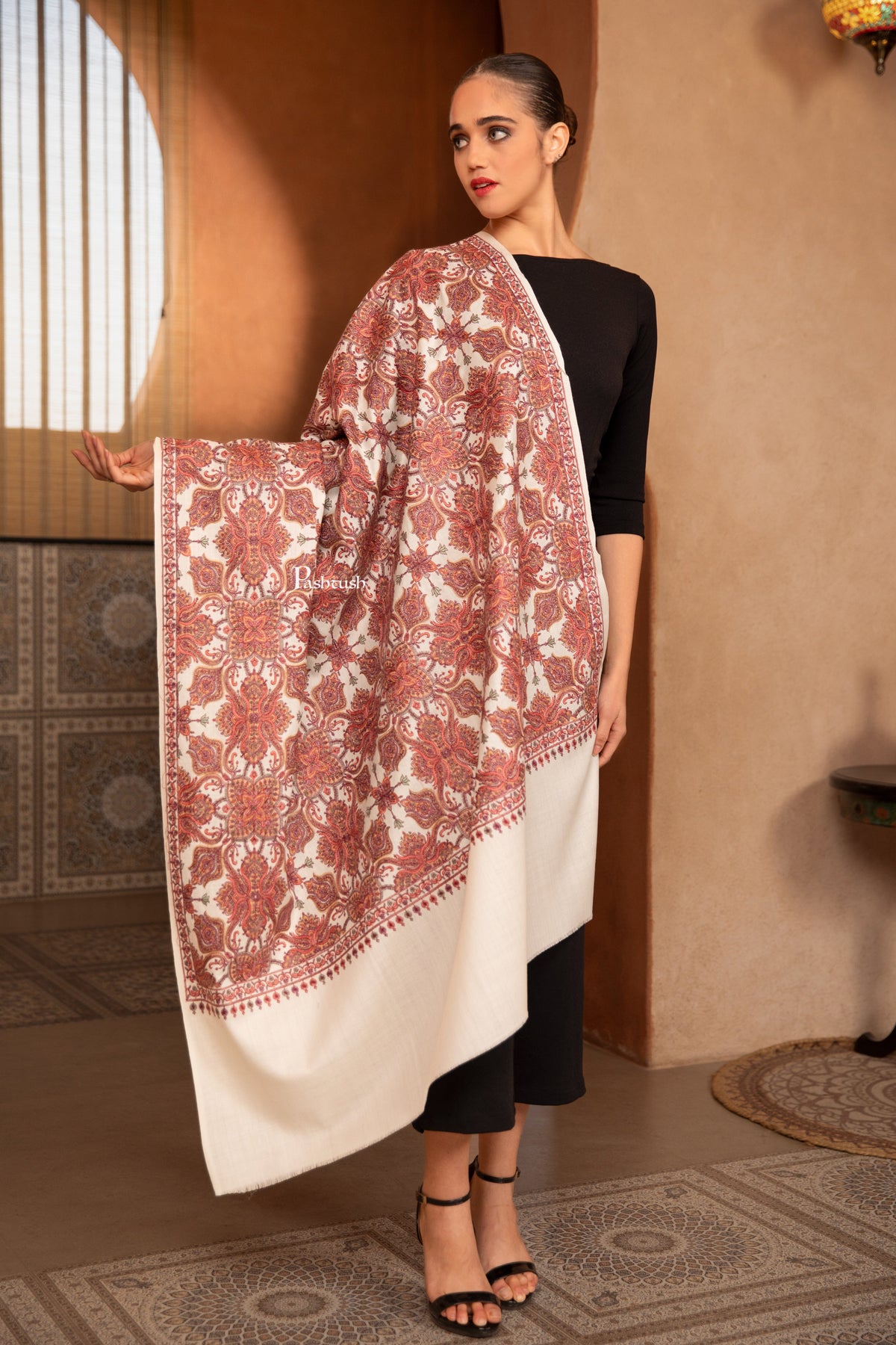 Pashtush India Womens Shawls Pashtush Womens Fine Wool Shawl, Multi Heavy Jaal Design, Ivory
