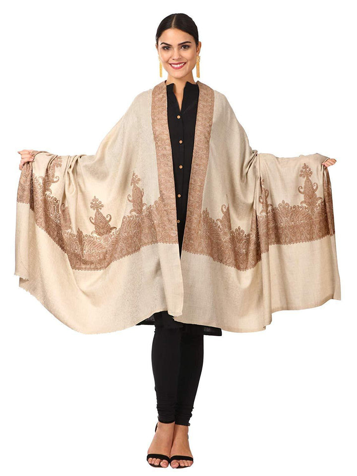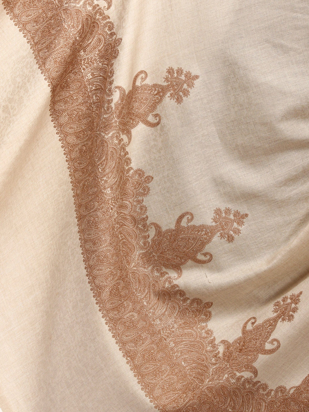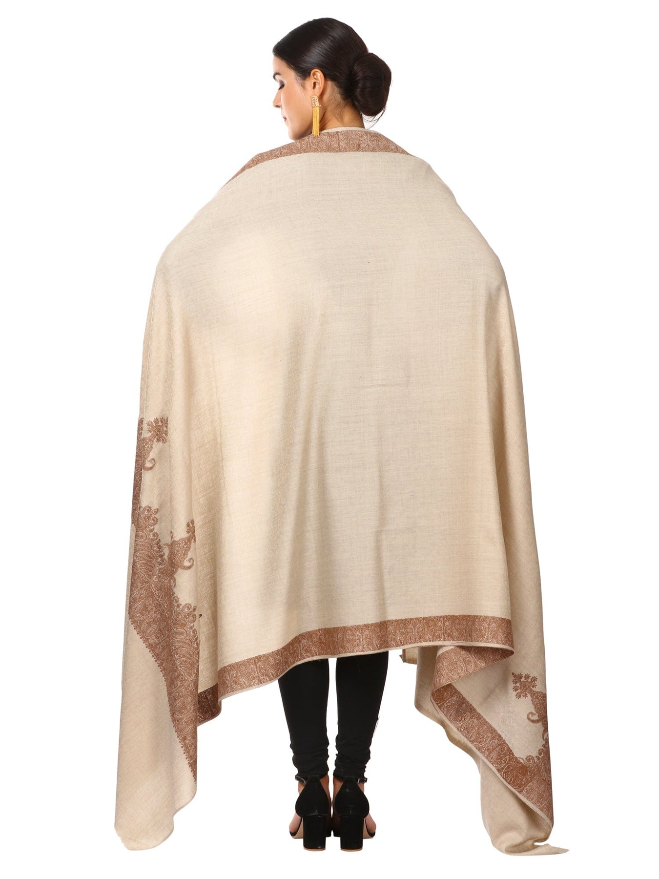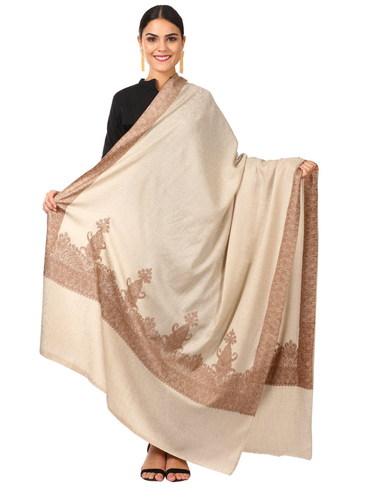 Pashtush Womens Shawl, Fine Wool Tone On Tone Palla Embroidery, Beige