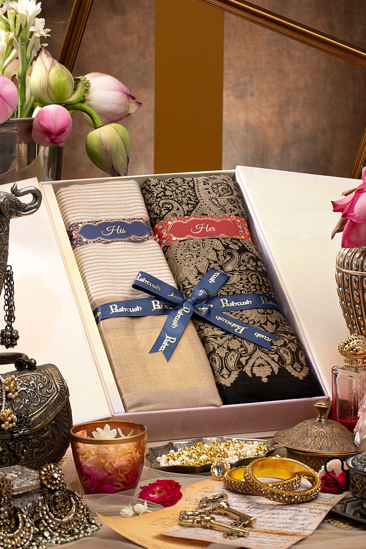 Pashtush His And Her Gift Set Of Banded Twilight Stoles With Premium Gift Box Packaging, Ivory And Black