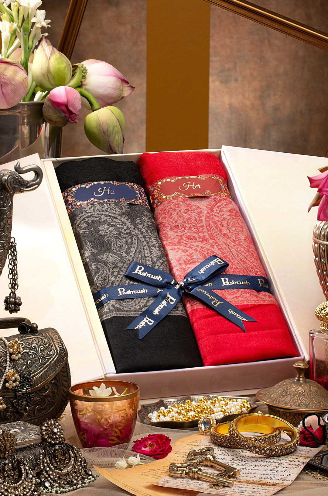 Pashtush His and Her set of Fine Wool Stoles, Premium Gift Box, Black and Scarlet Red
