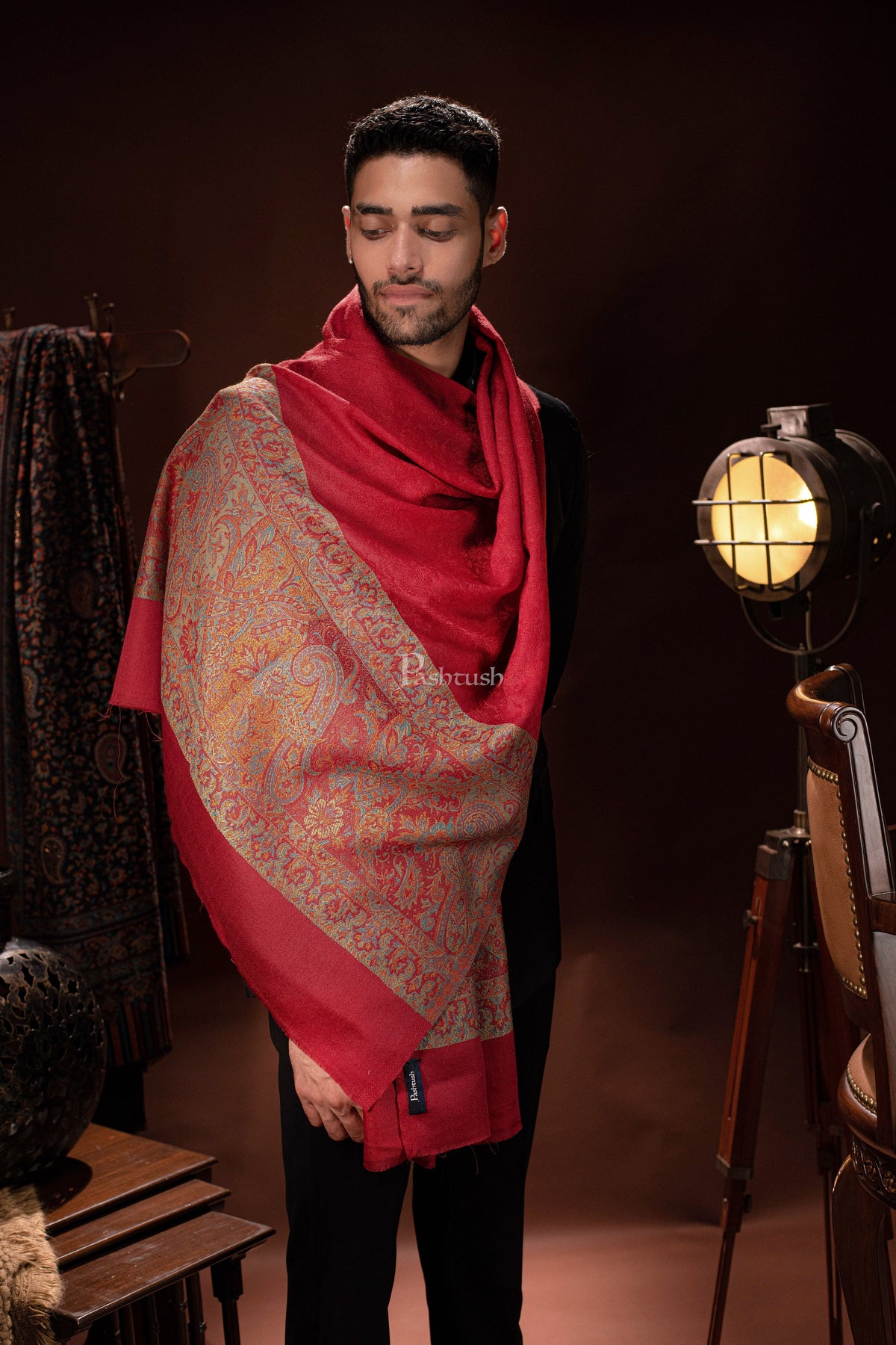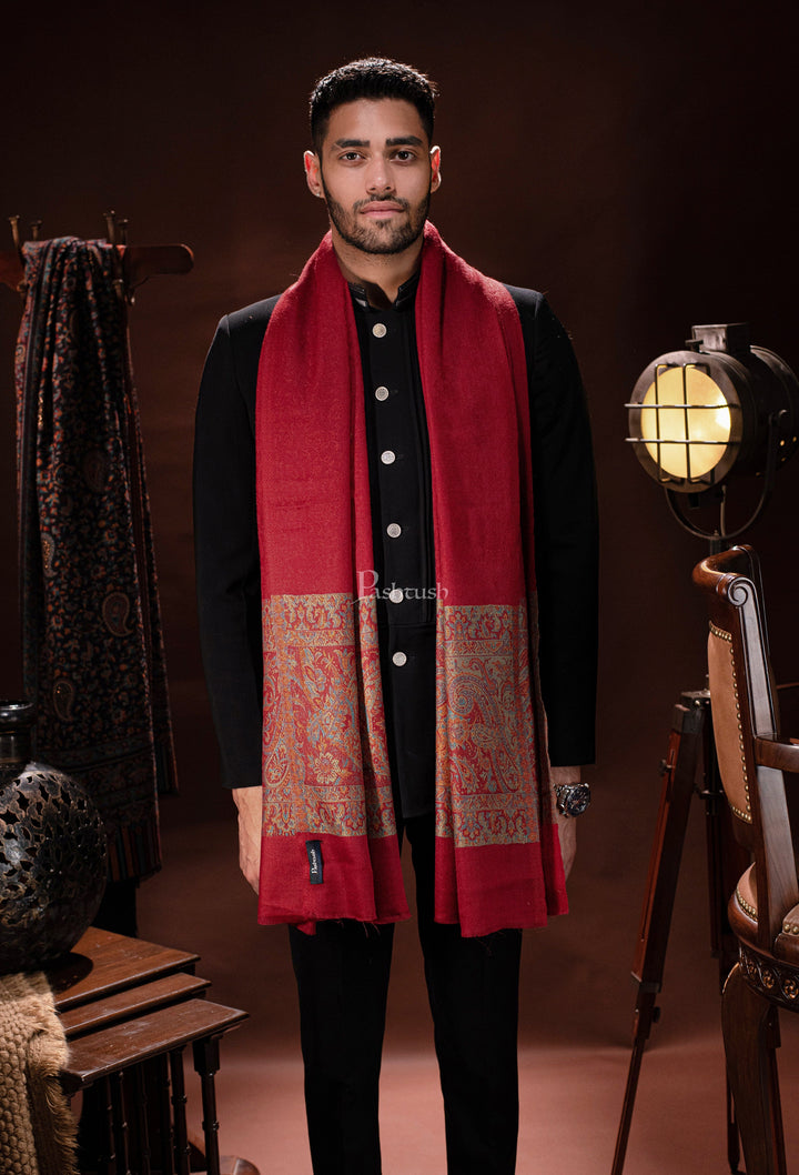 Pashtush mens Extra Fine Wool self stole, ethnic palla design, Maroon