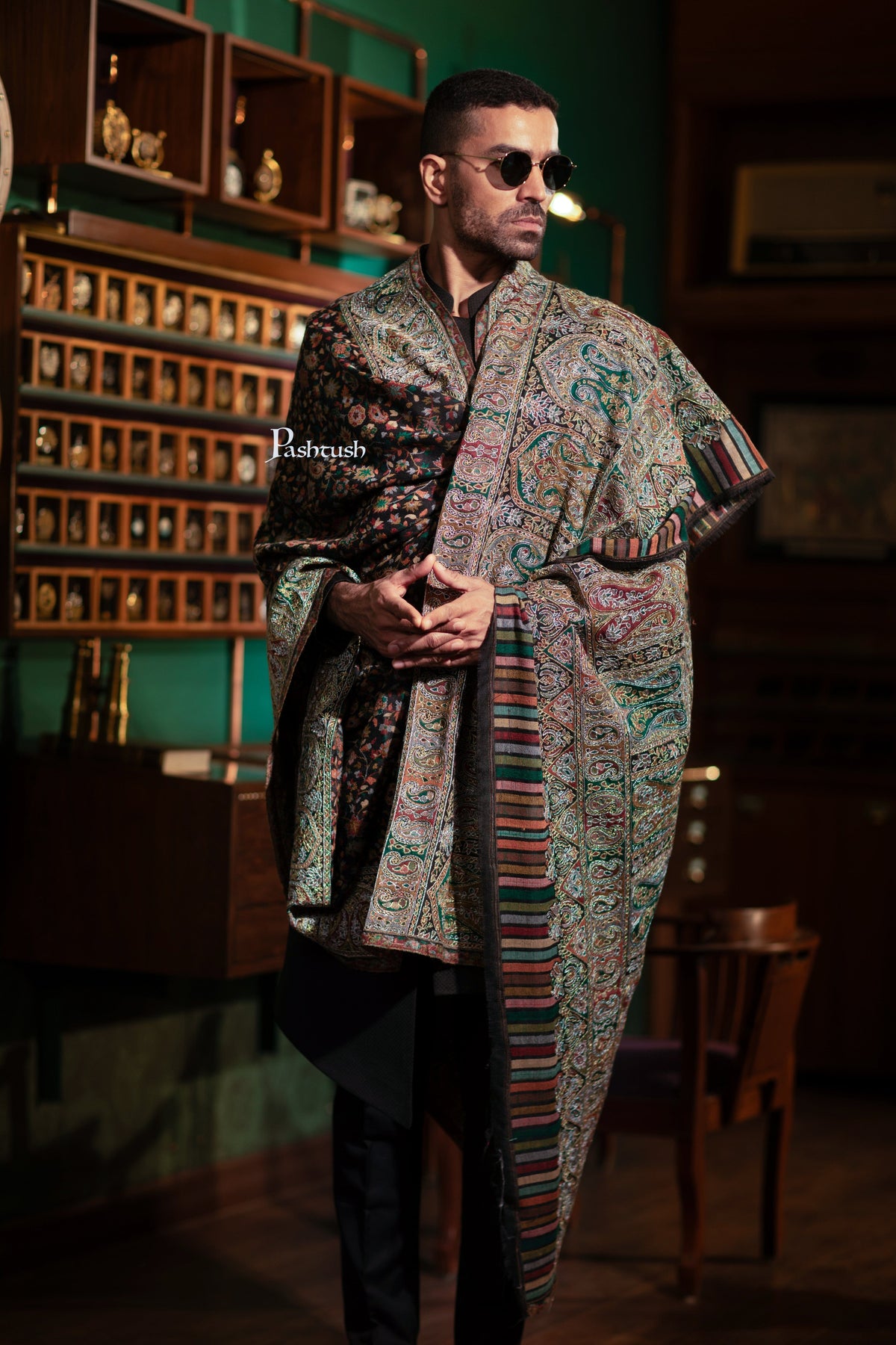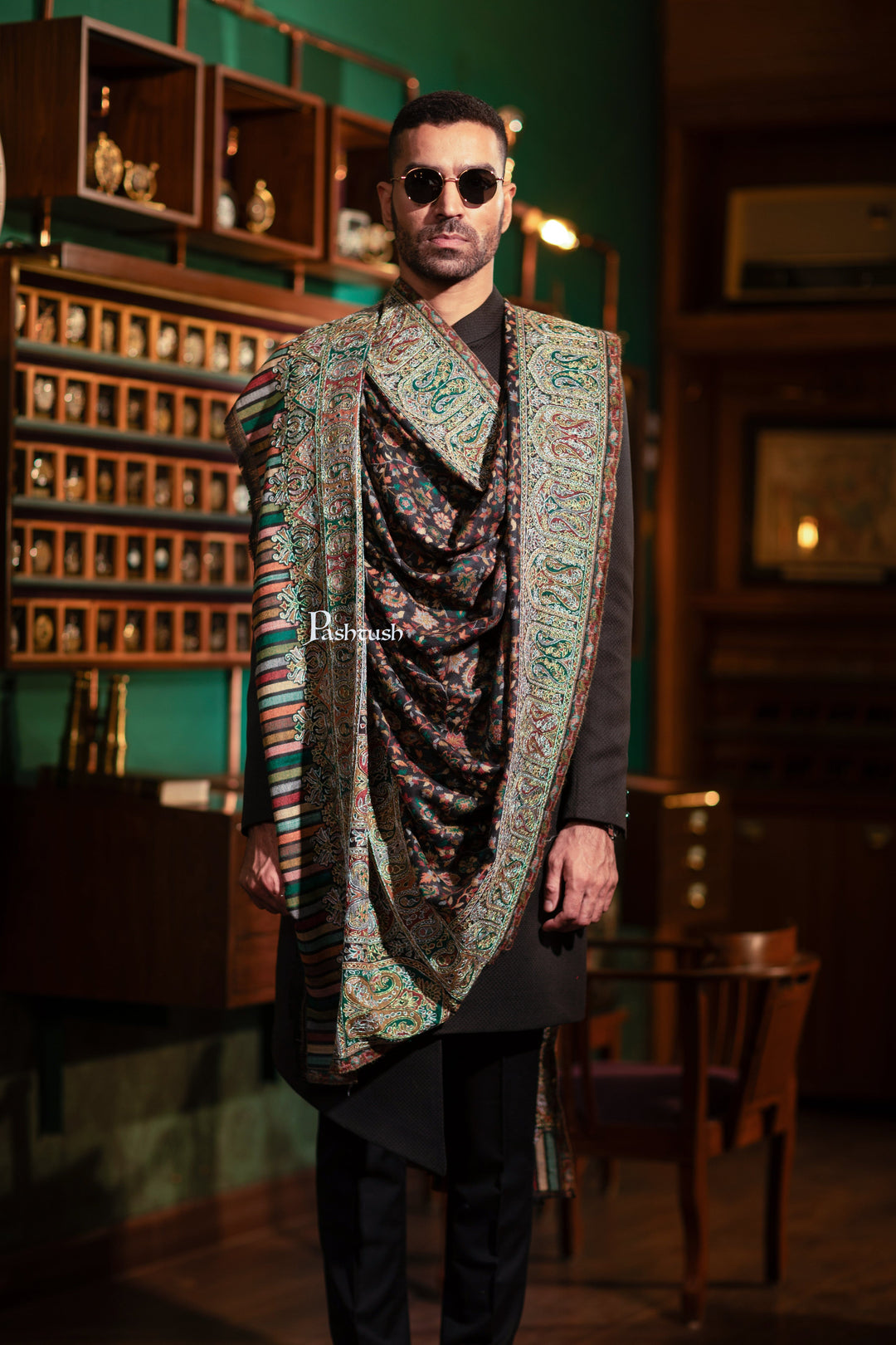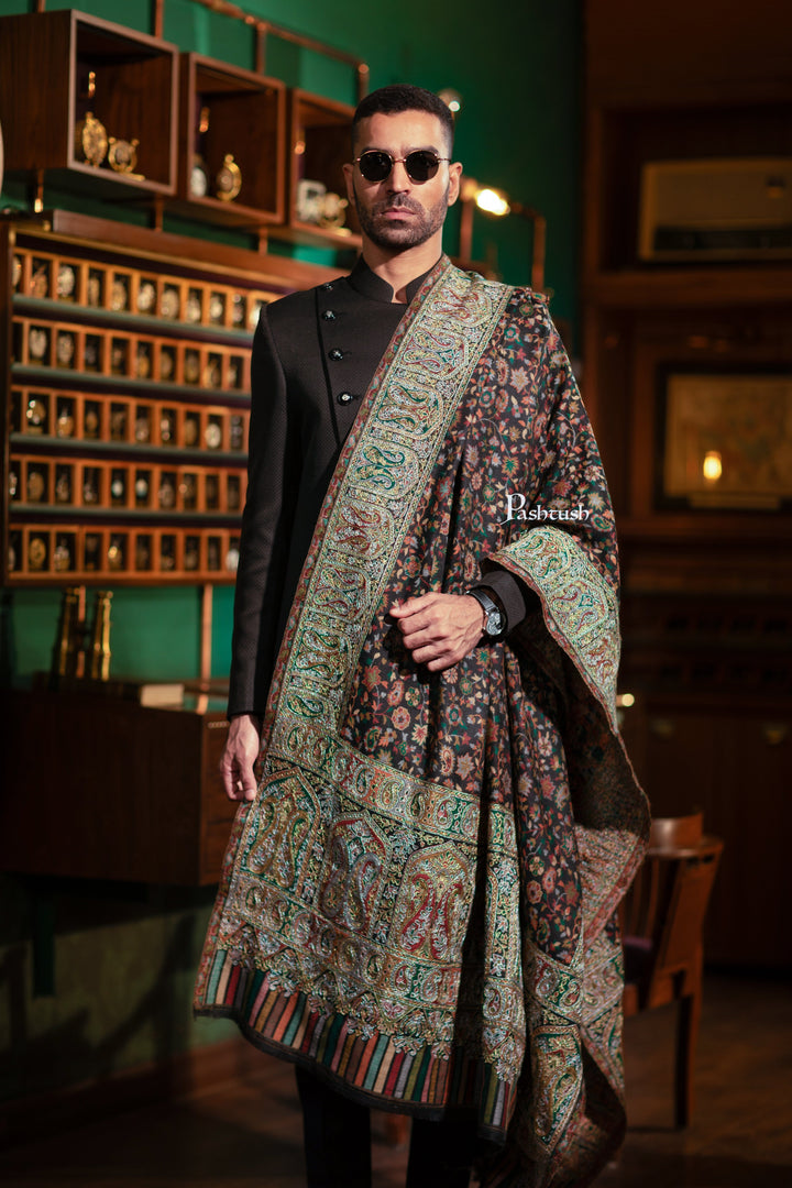 Pashtush Mens Extra Fine Wool Shawl, Nalki Hand Embroidery Design, Black