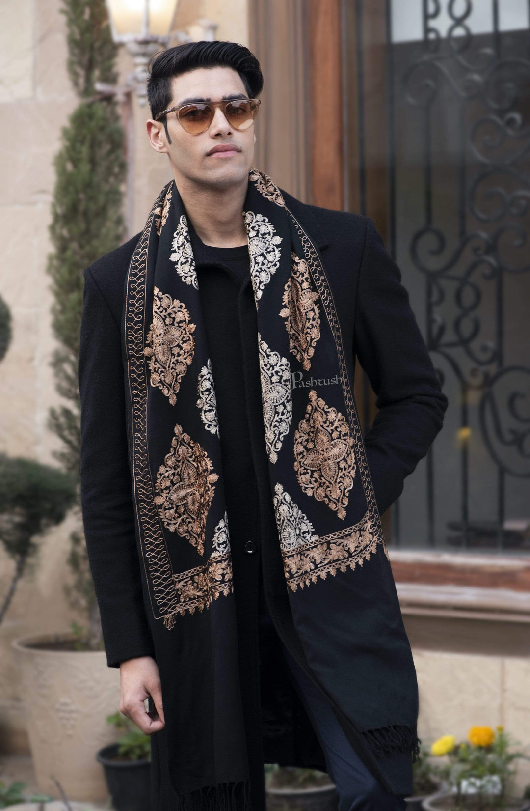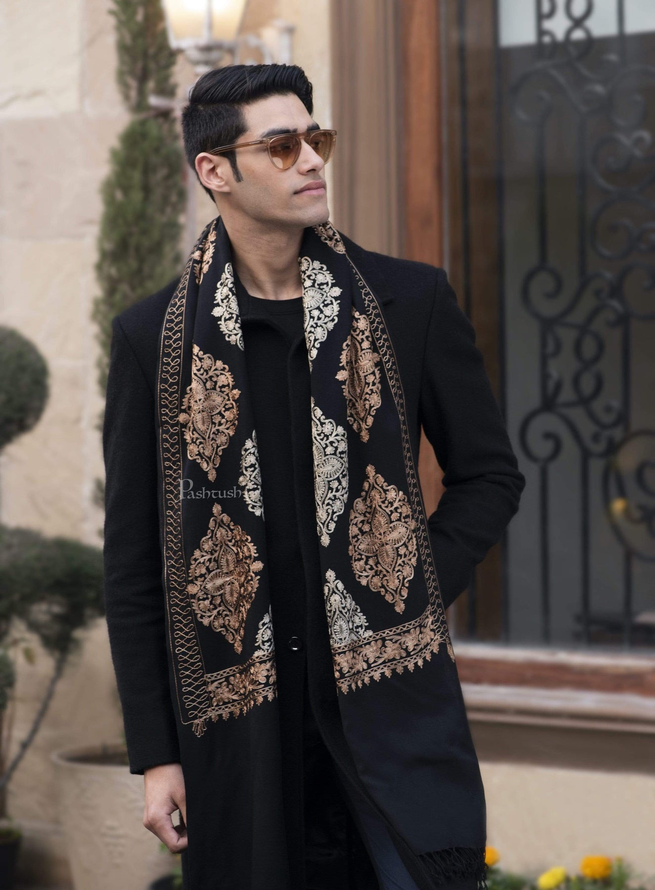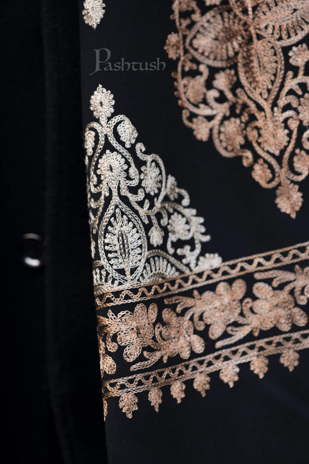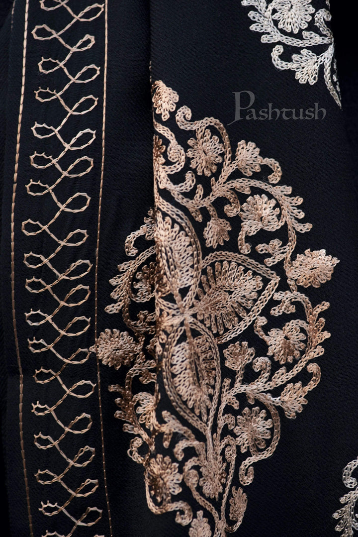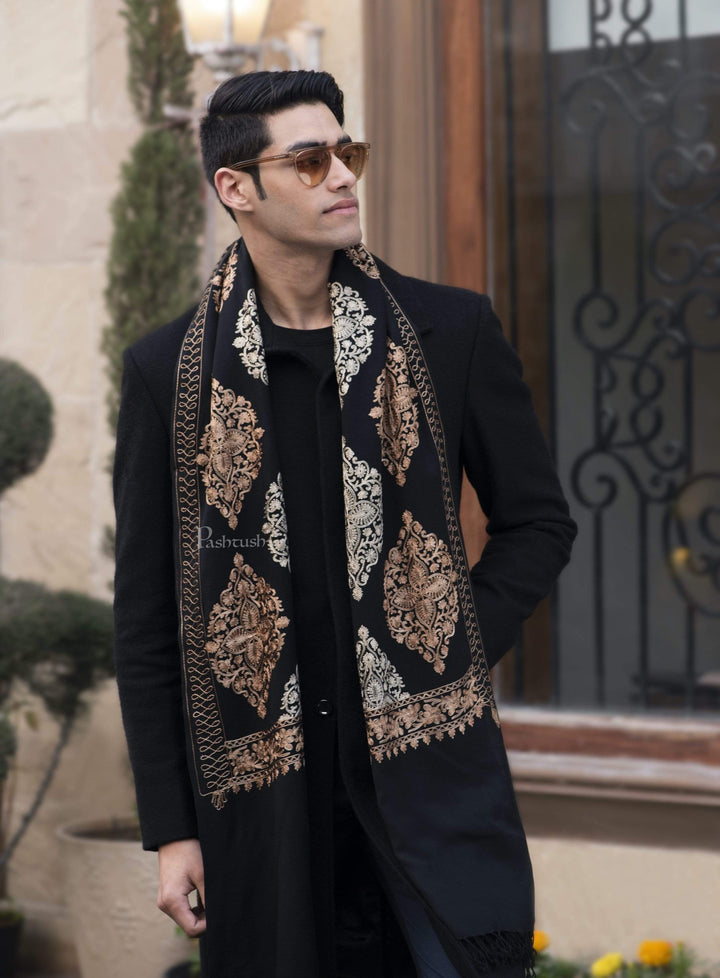Pashtush Mens Fine Wool, Silky Embroidery Needlework Stole, Black
