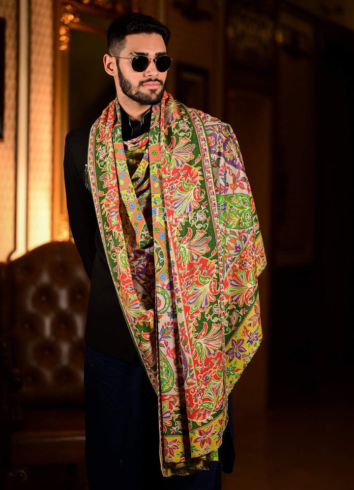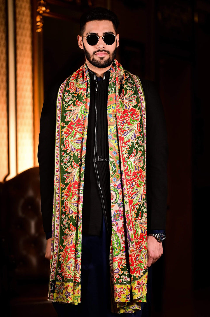 Pashtush Mens Pure Wool, Hand Embroidered Kalamkari Stole, With Woolmark Certificate