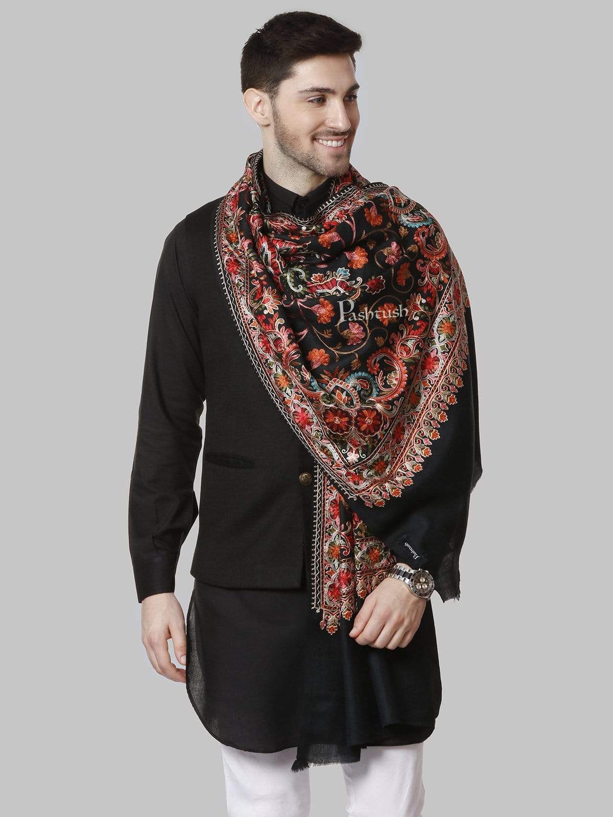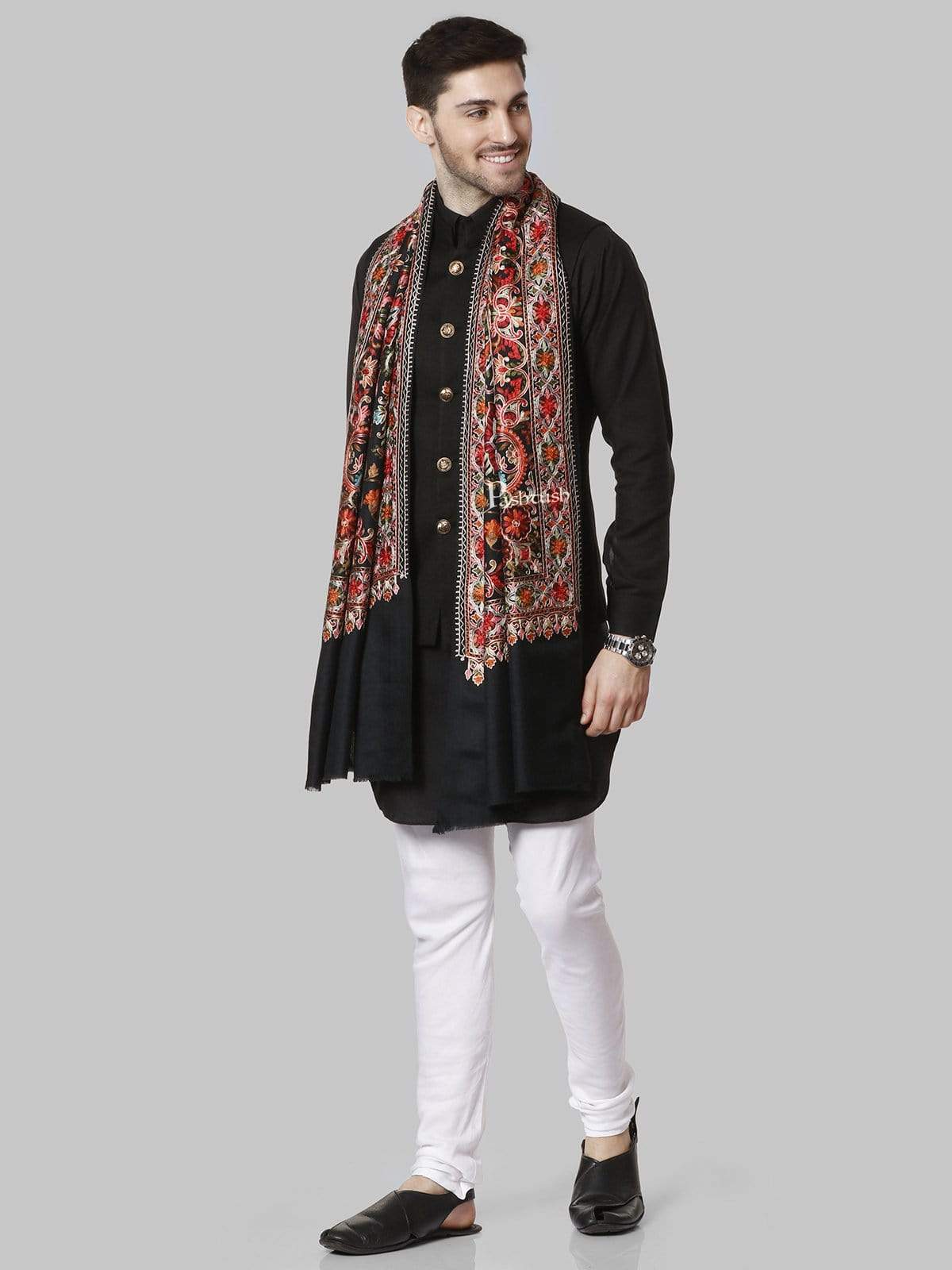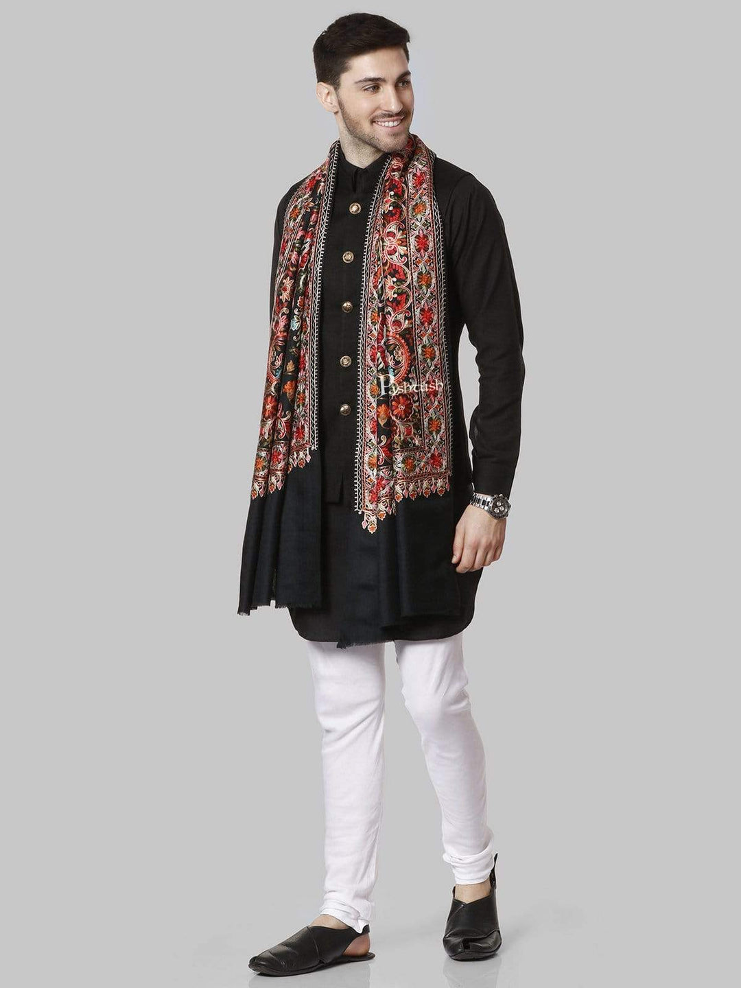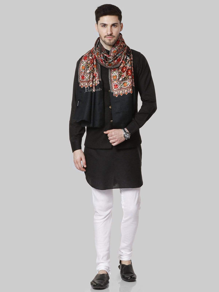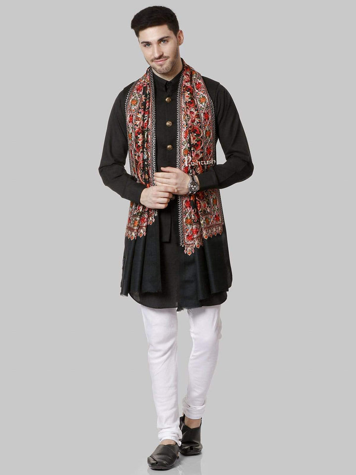 Pashtush Mens Regal Collection, Fine Wool Embroidery Stole, Rich Black