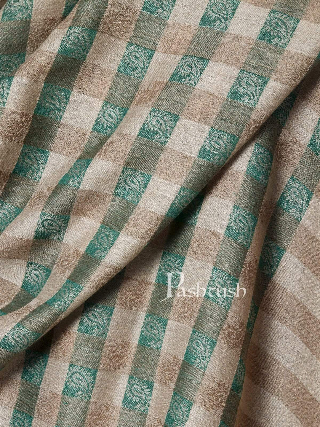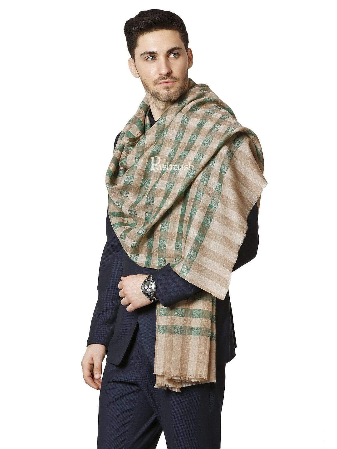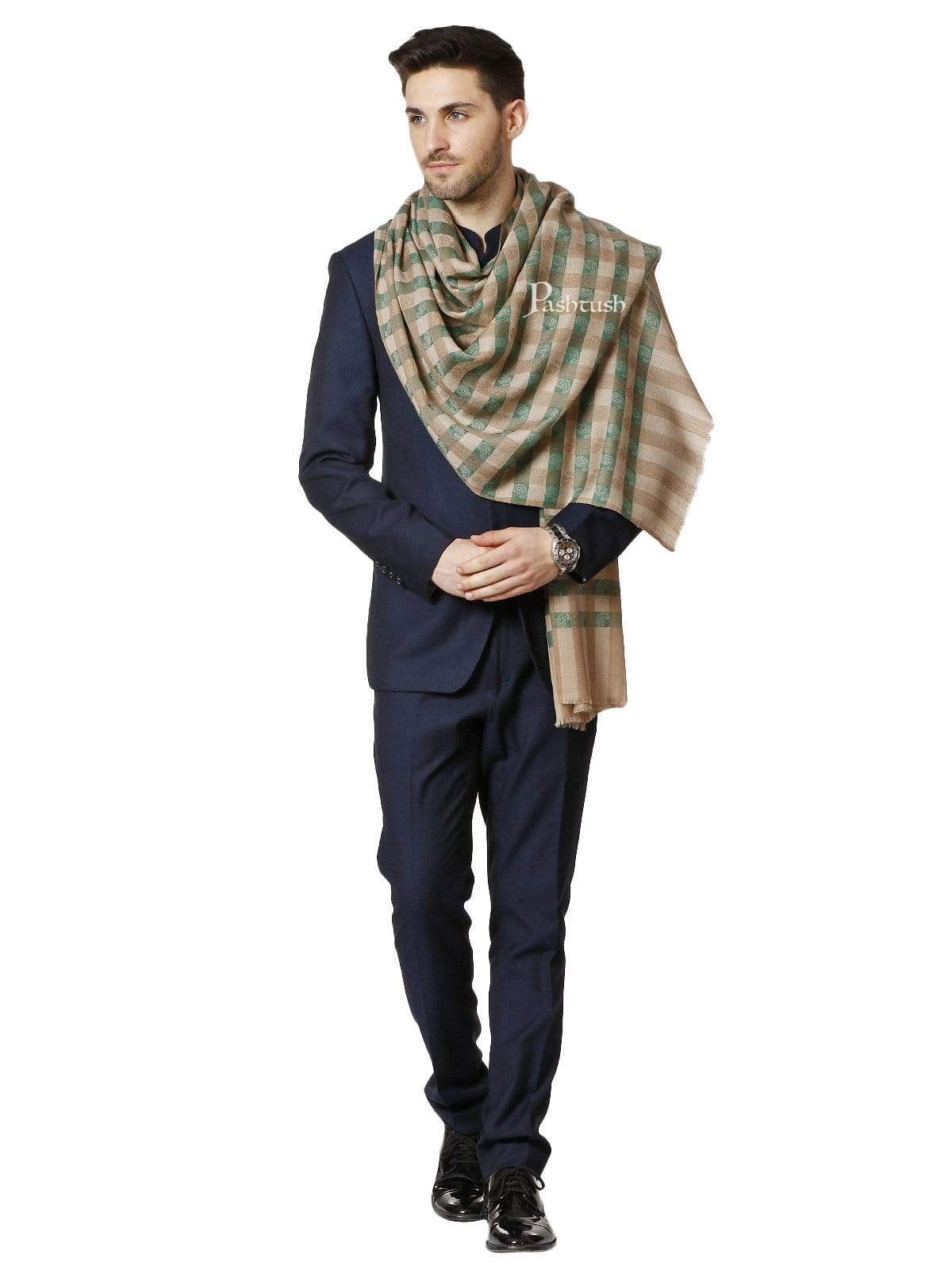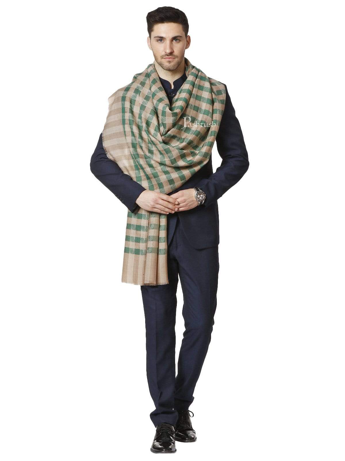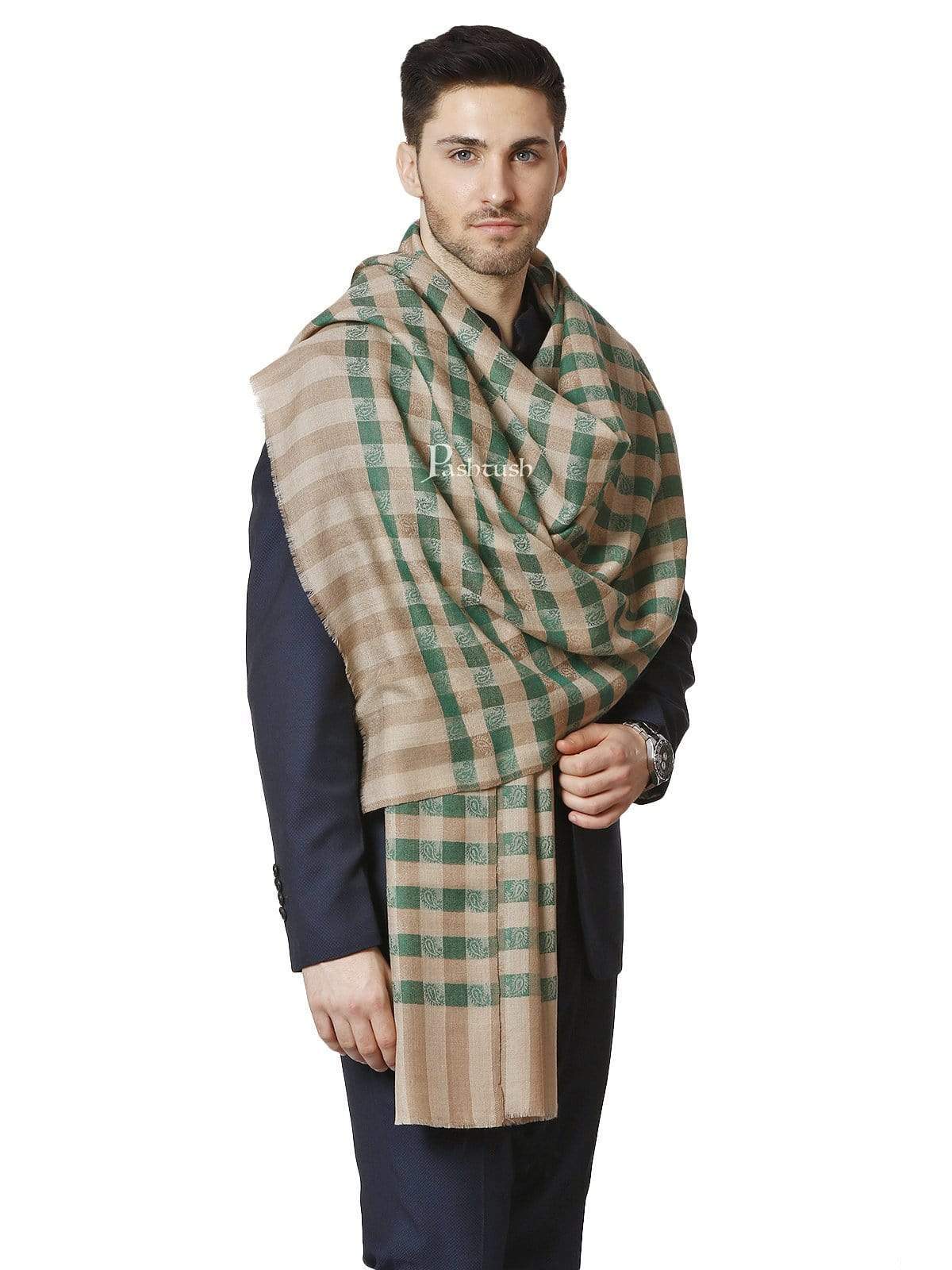 Pashtush Mens Fine Wool Checkered Stole, Green And Beige