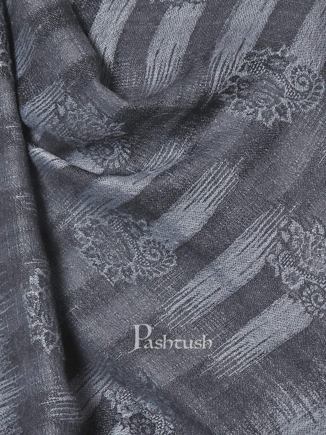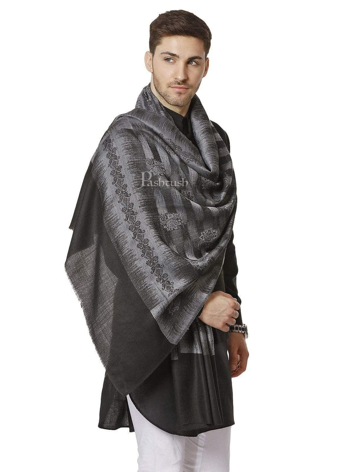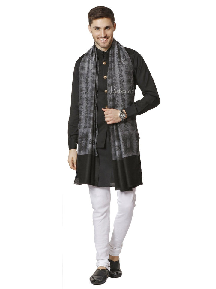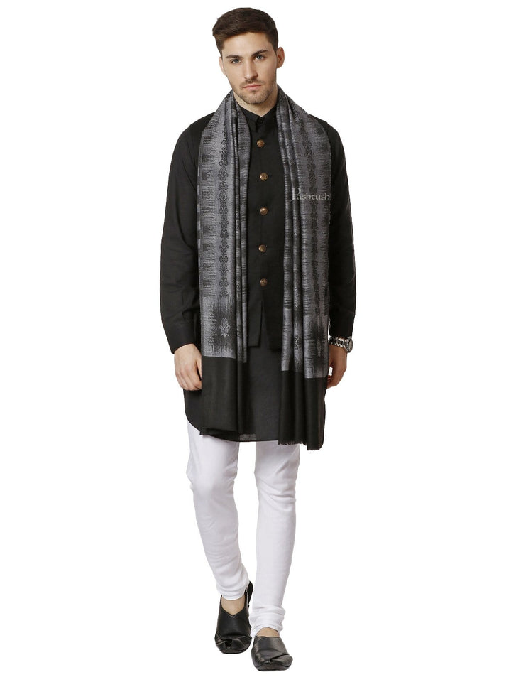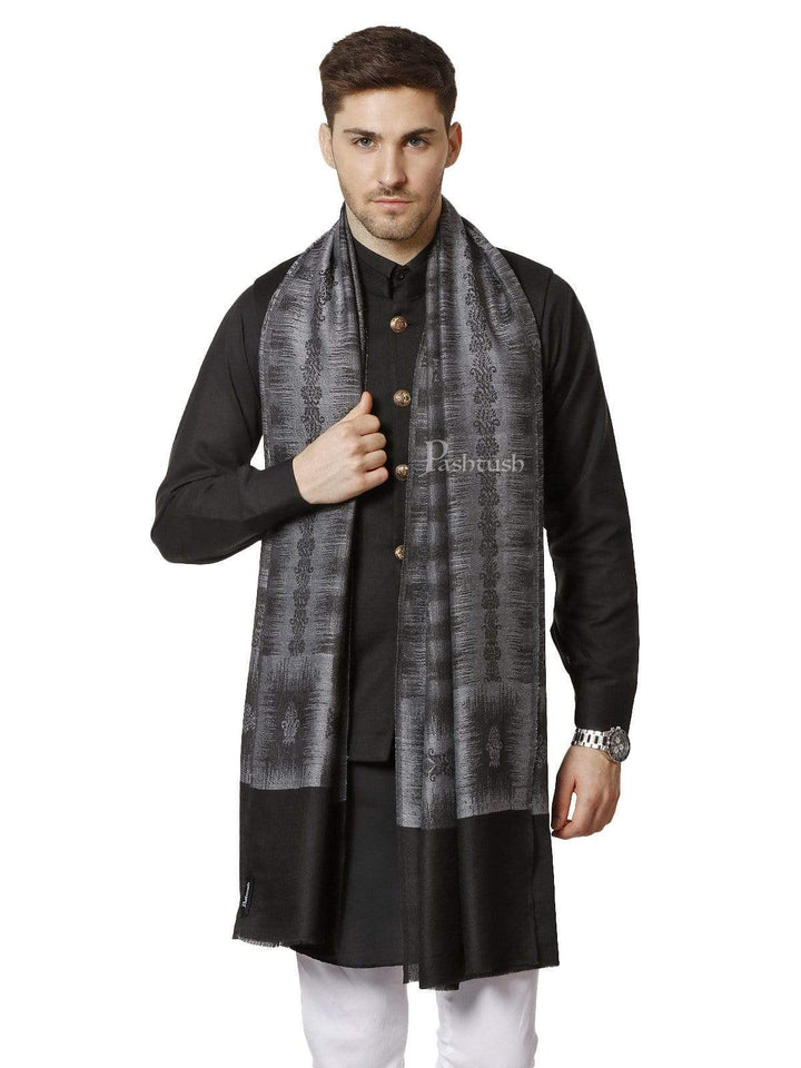 Pashtush Mens Fine Wool Ikkat Design, Stole, Black And Grey