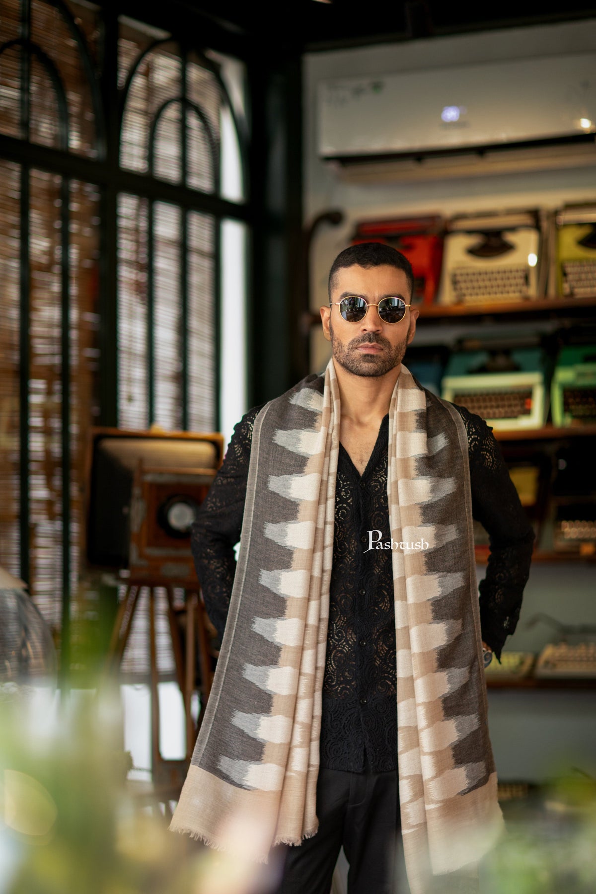 Pashtush Mens Cashmere Stole, Ikkat Design, Beige