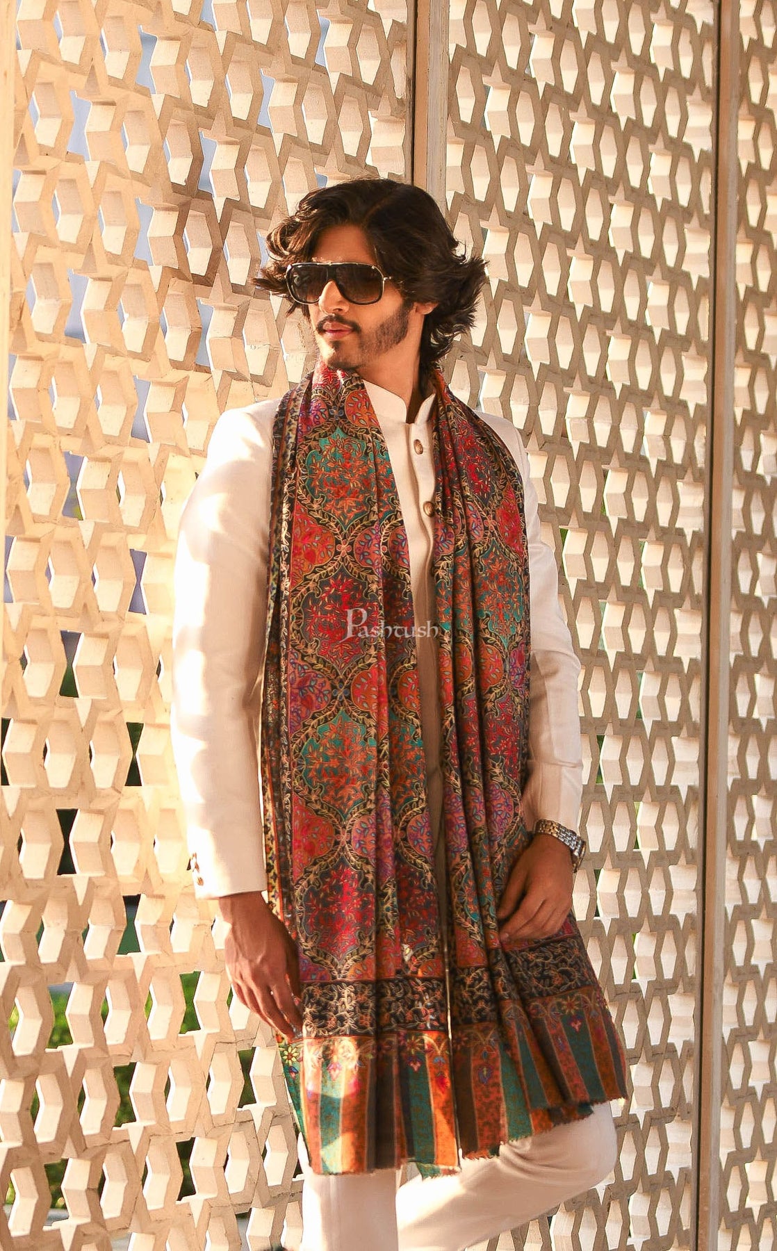 Pashtush Pure Wool, Woolmark Certified, Mens Embroidery Kalamkari Stole, Multicoloured