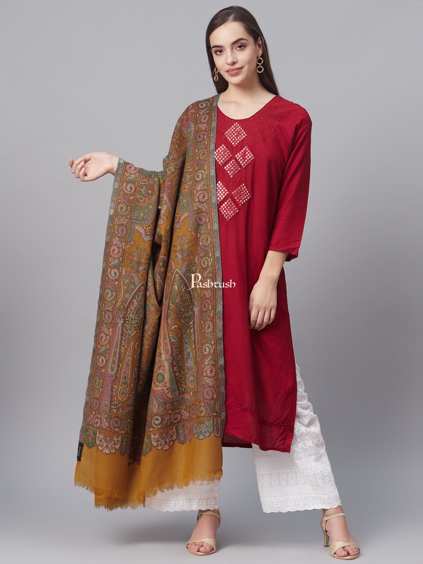 Pashtush Women 100% Pure Wool, With Woolmark Certificate, Woven Kalamkari Design Shawl, Mustard
