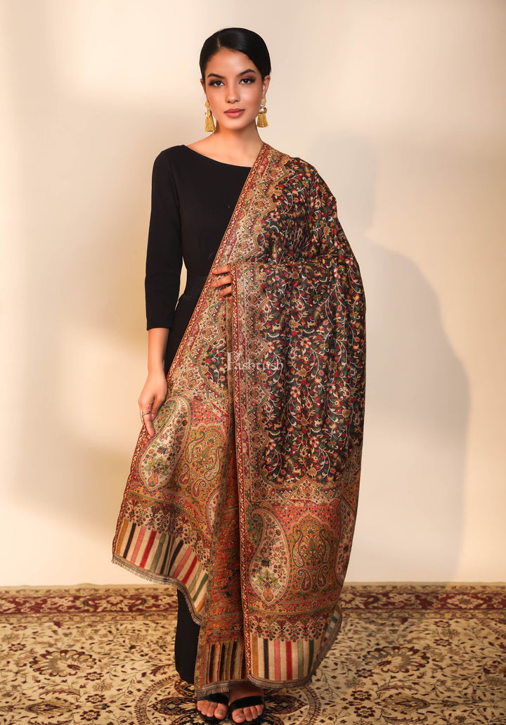 Pashtush women faux pashmina shawl, ethnic weave design, black