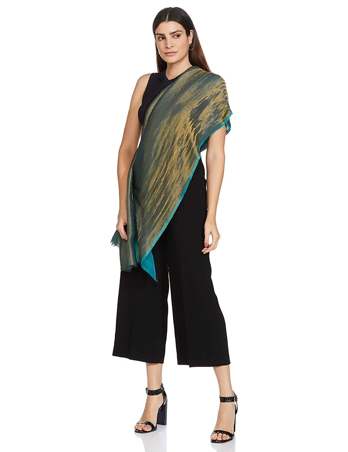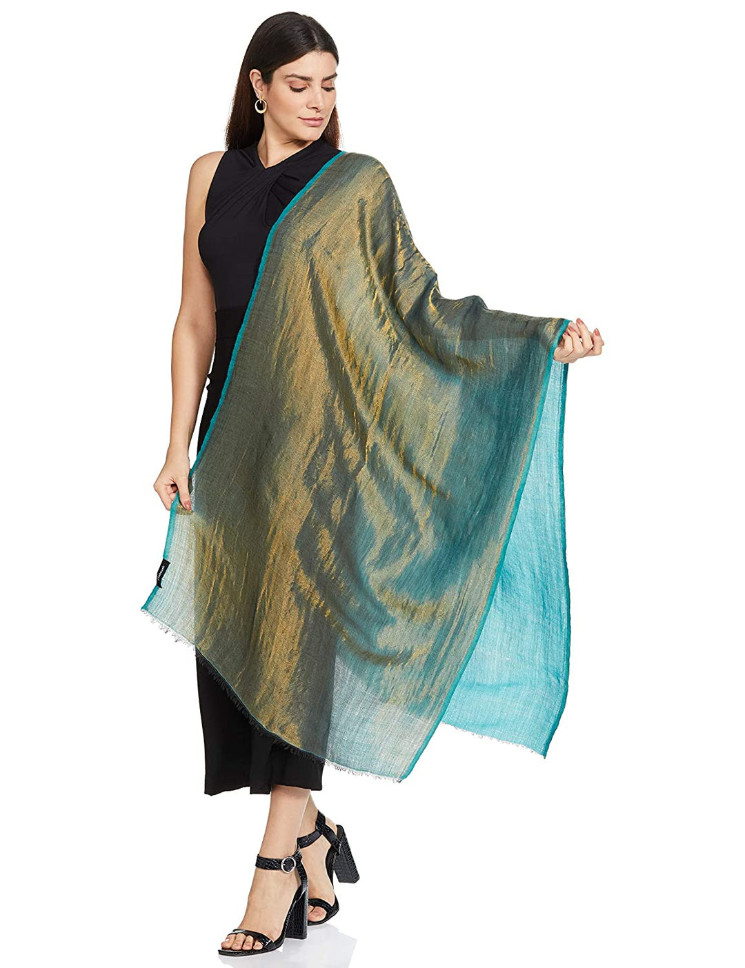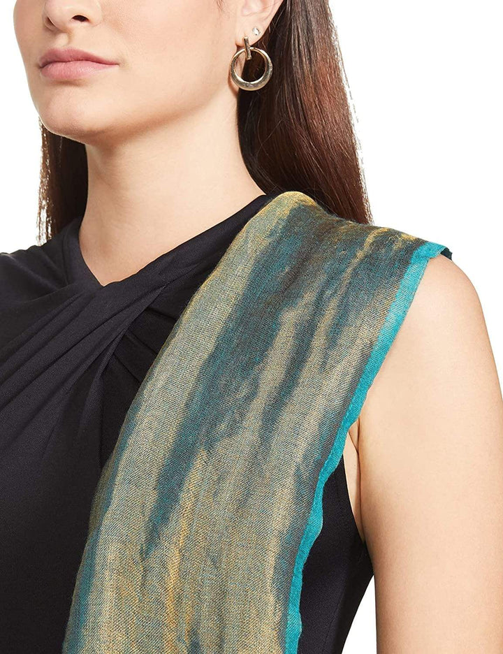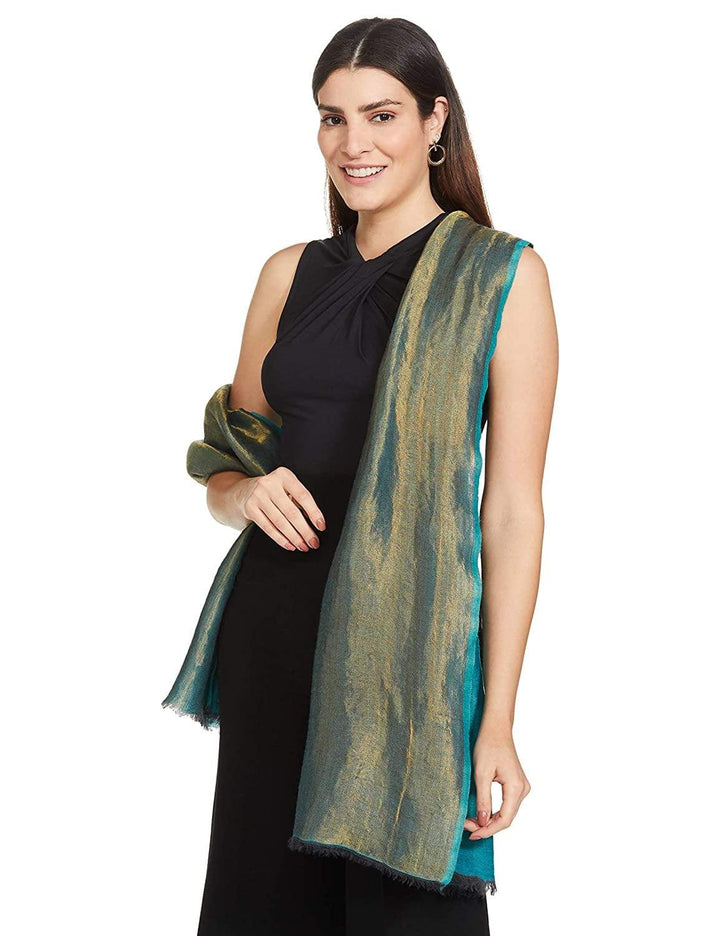 Pashtush India 70x200 Pashtush Womens Twilight Scarf, Reversible Golden Weave, Aqua Blue And Gold