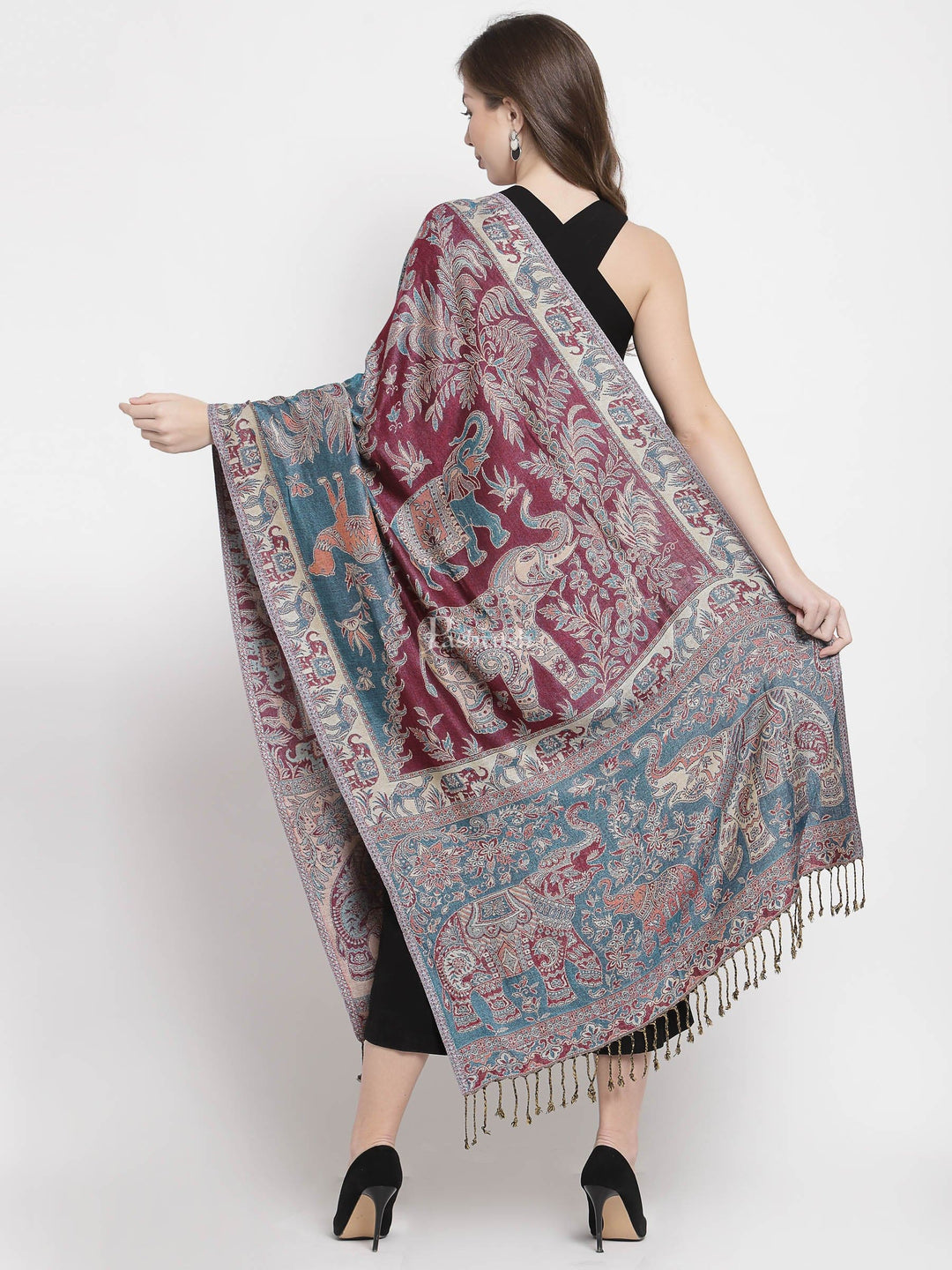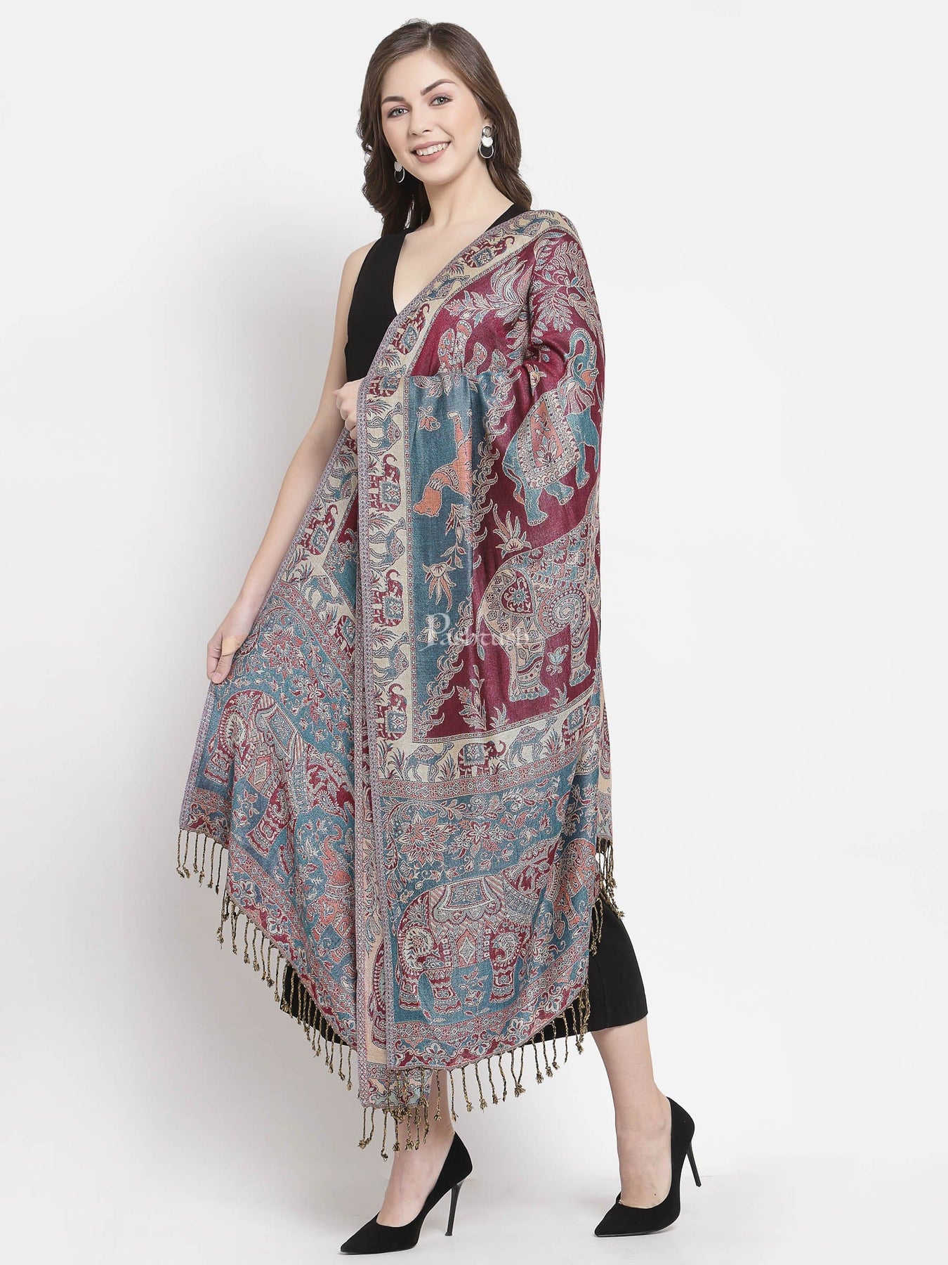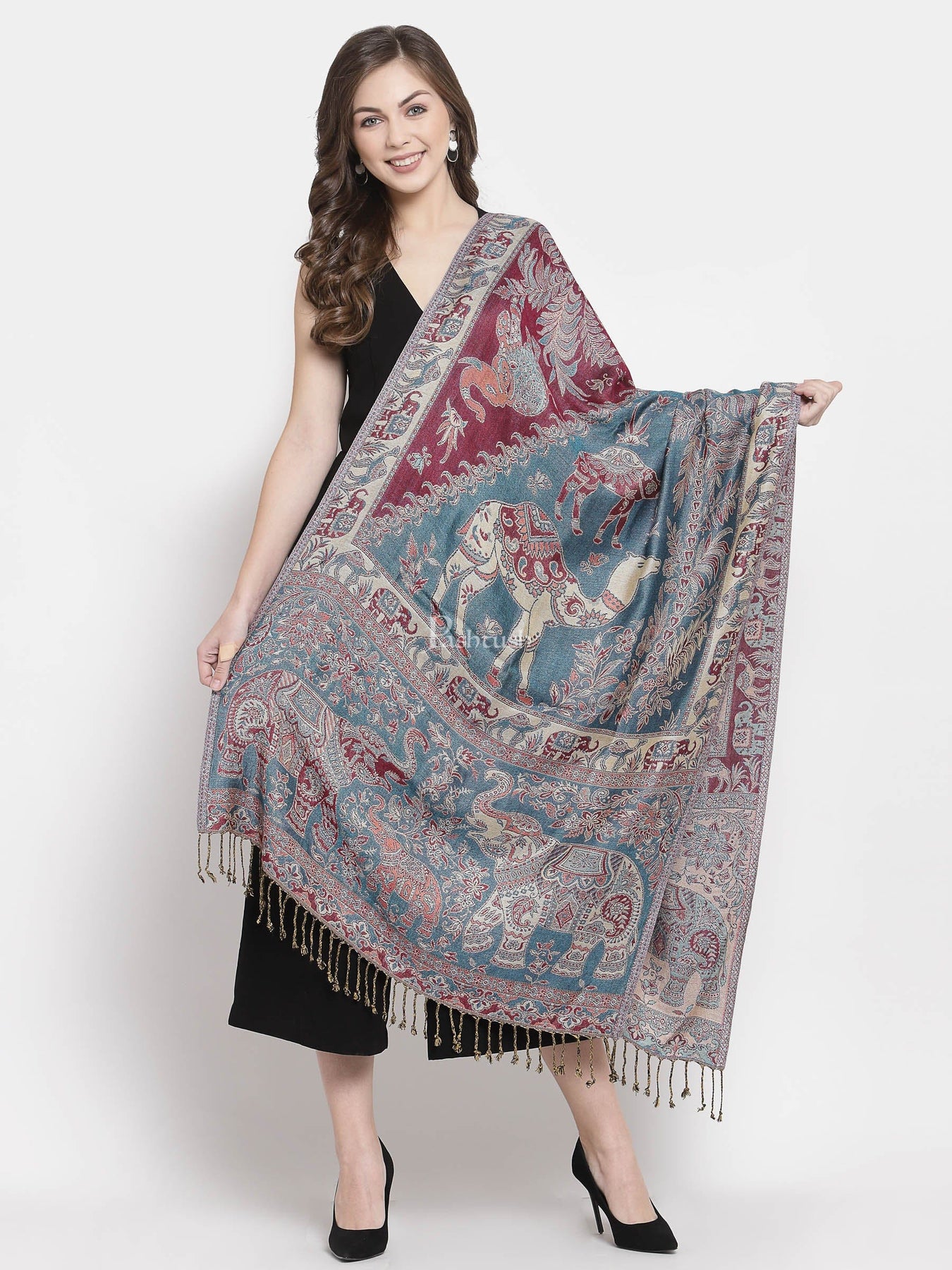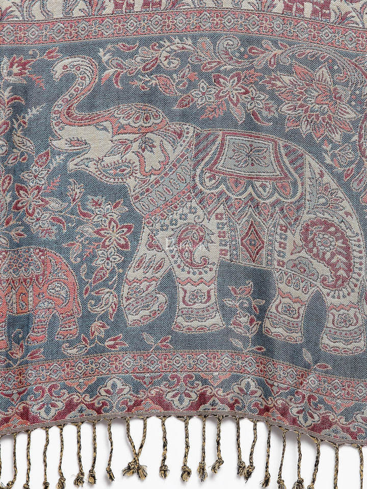 Pashtush Womens Bamboo Reversible Stole, Tribal Elephants, Azure