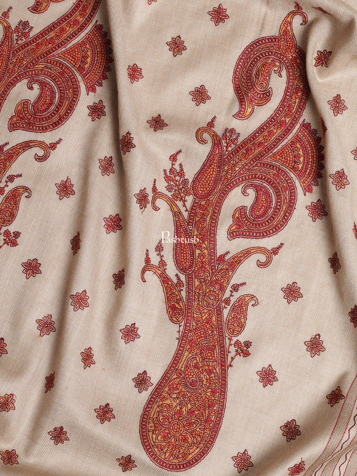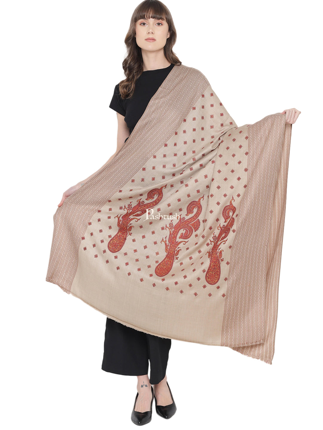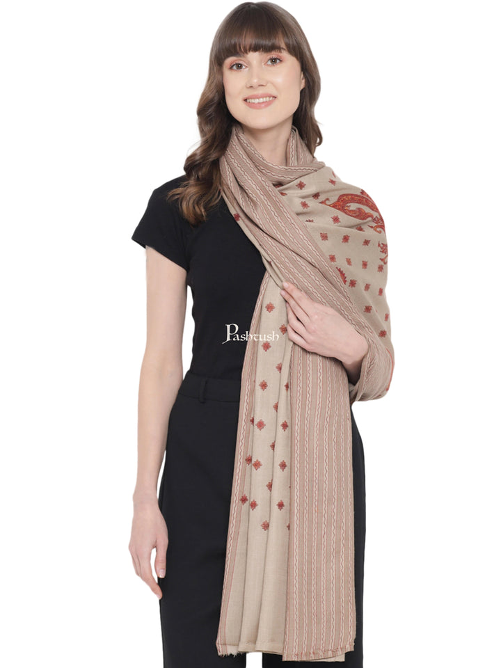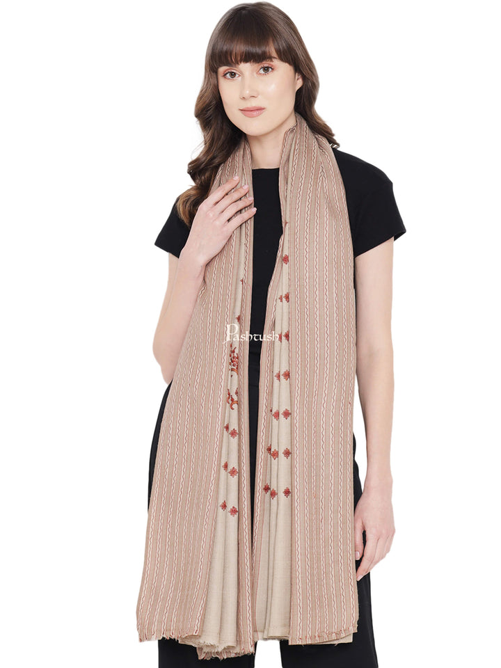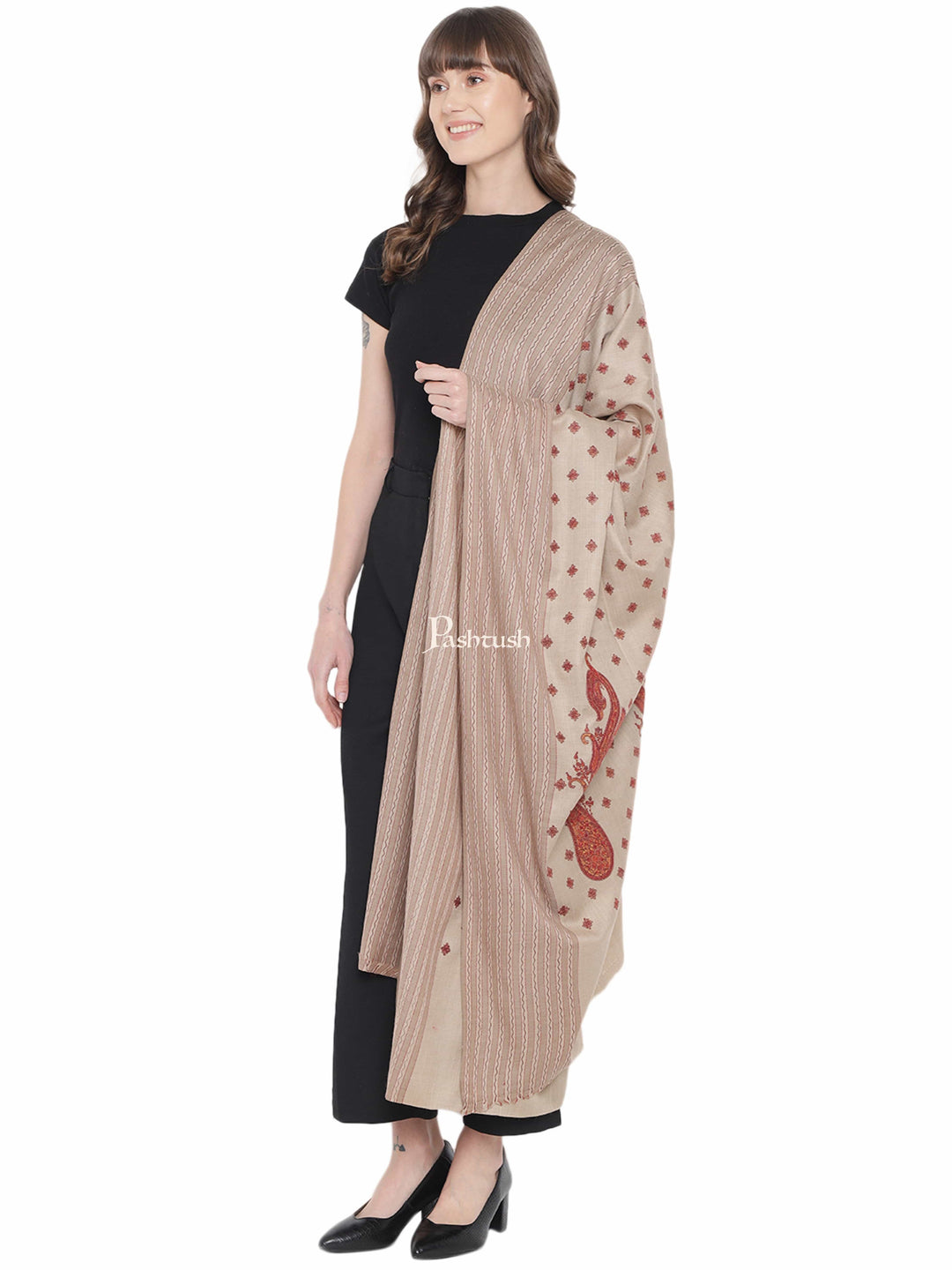 Pashtush Womens Embroidery Shawl, Khakikar , Fine Wool, Beige