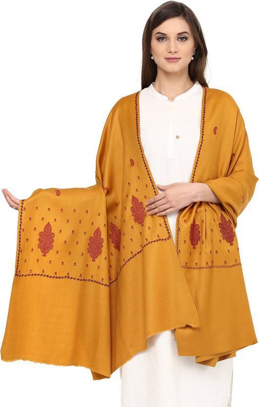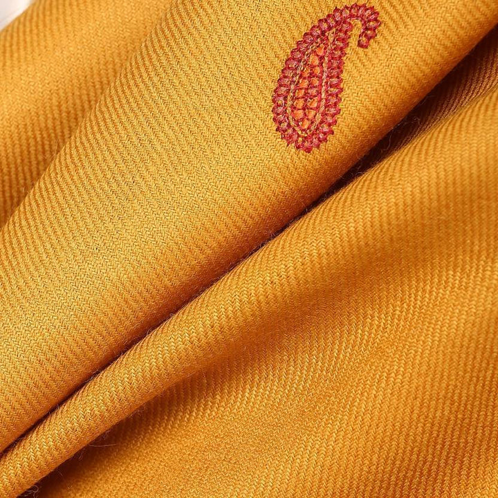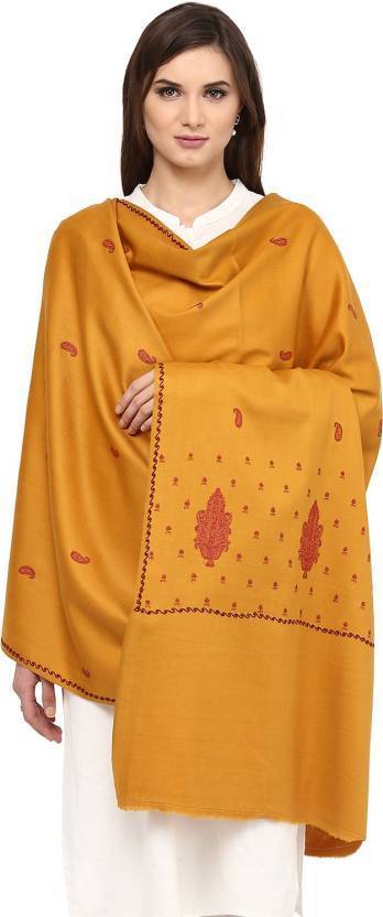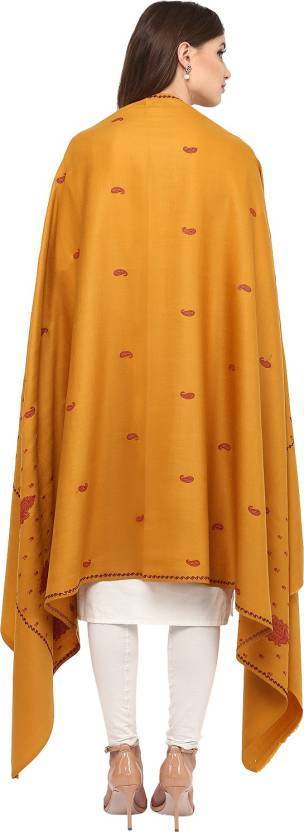 Pashtush Women'S Embroidery Wool Shawl, Mustard With Palla Embroidery Paisley Design