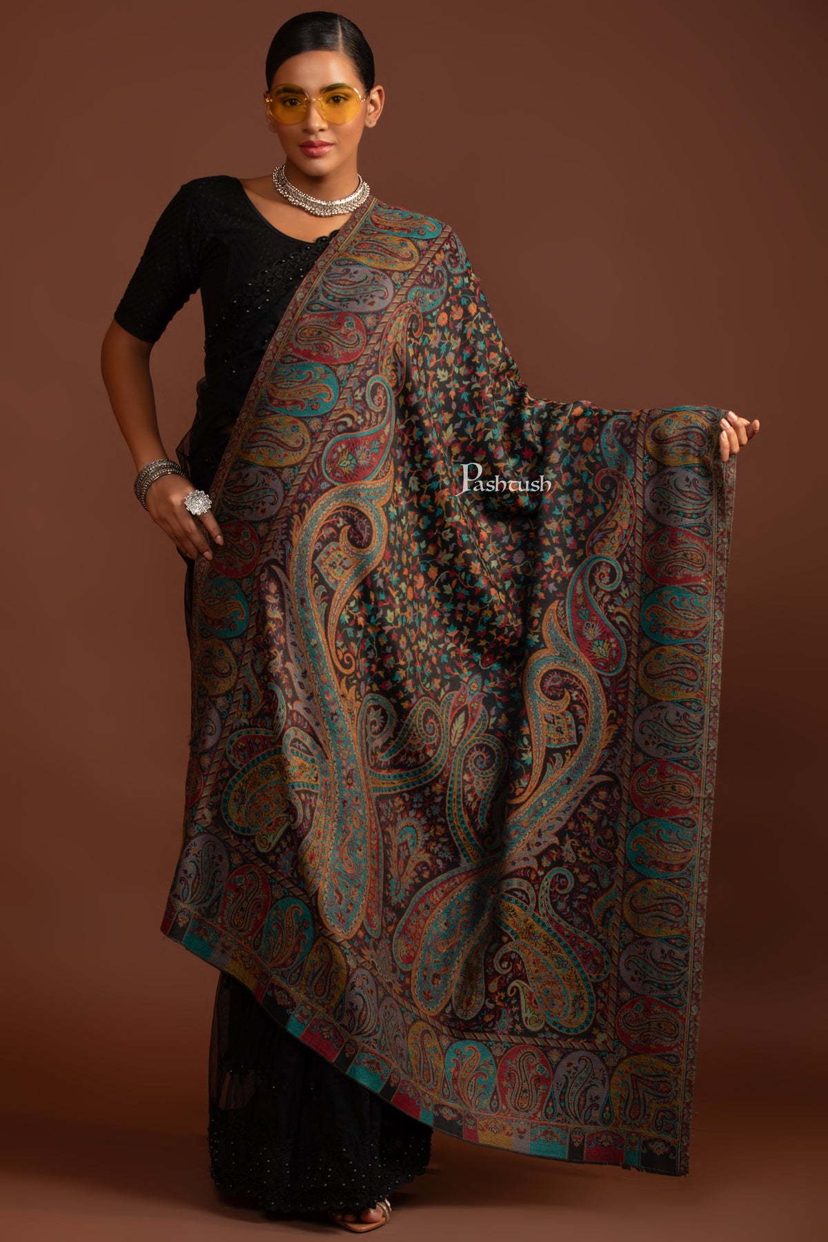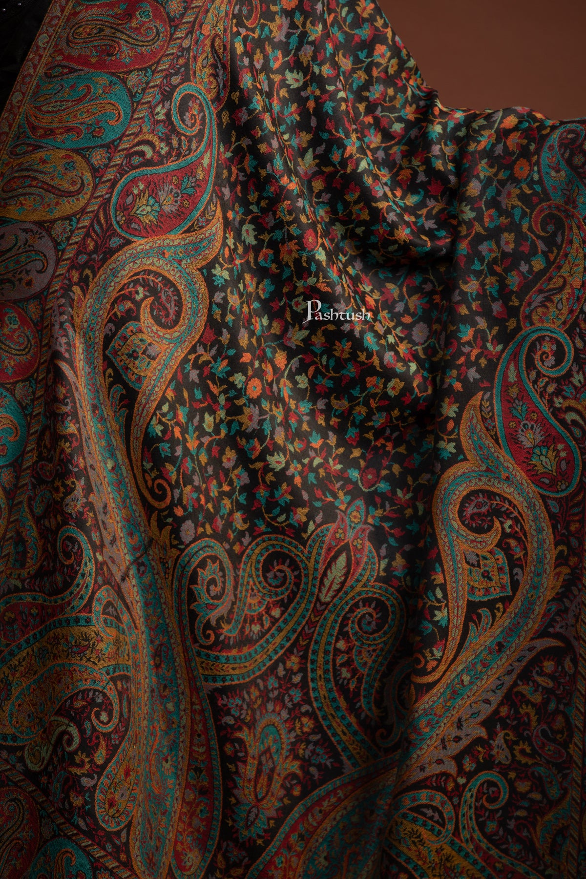 Pashtush Womens Extra Fine Wool Shawl, Antique Ethnic Weave Design, Black