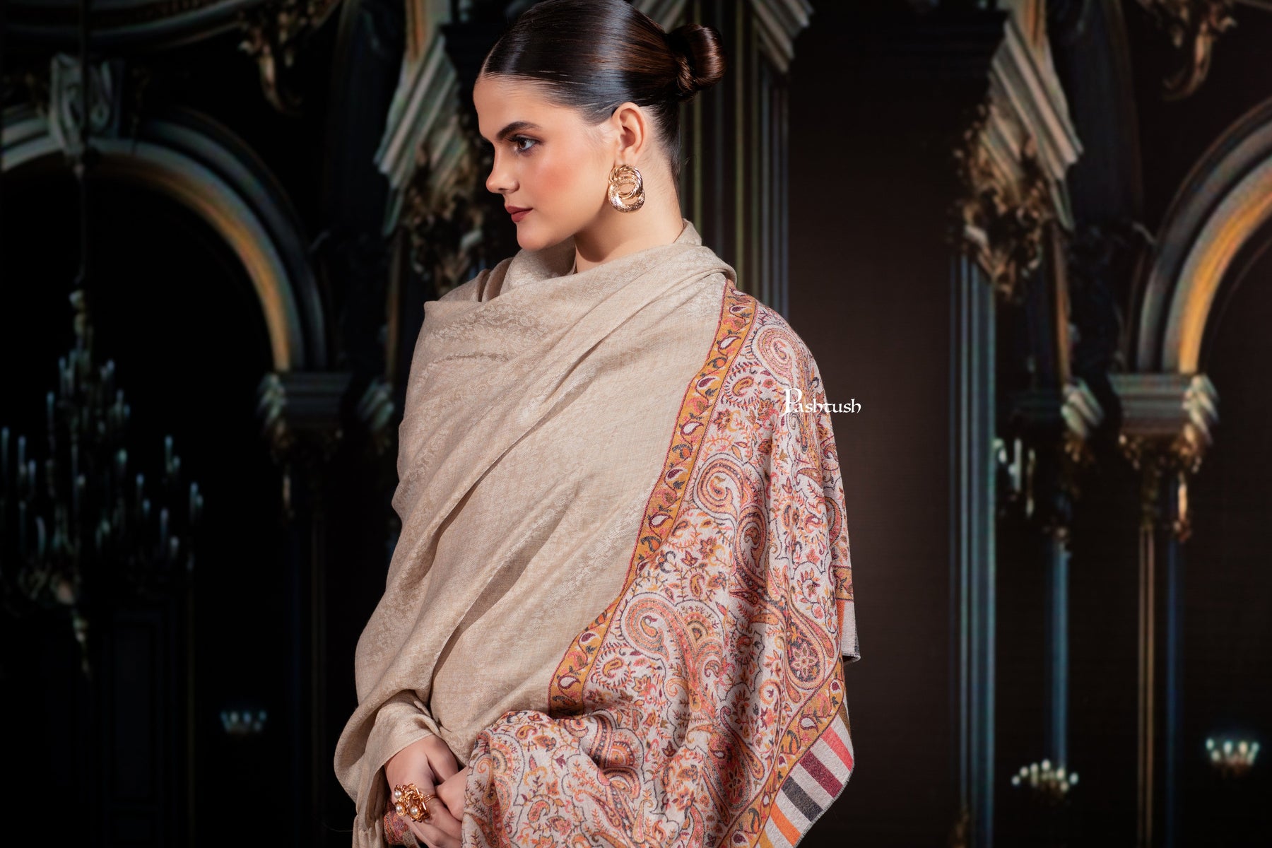 Pashtush Womens Extra Fine Wool Shawl, Paisley Palla Design, Beige