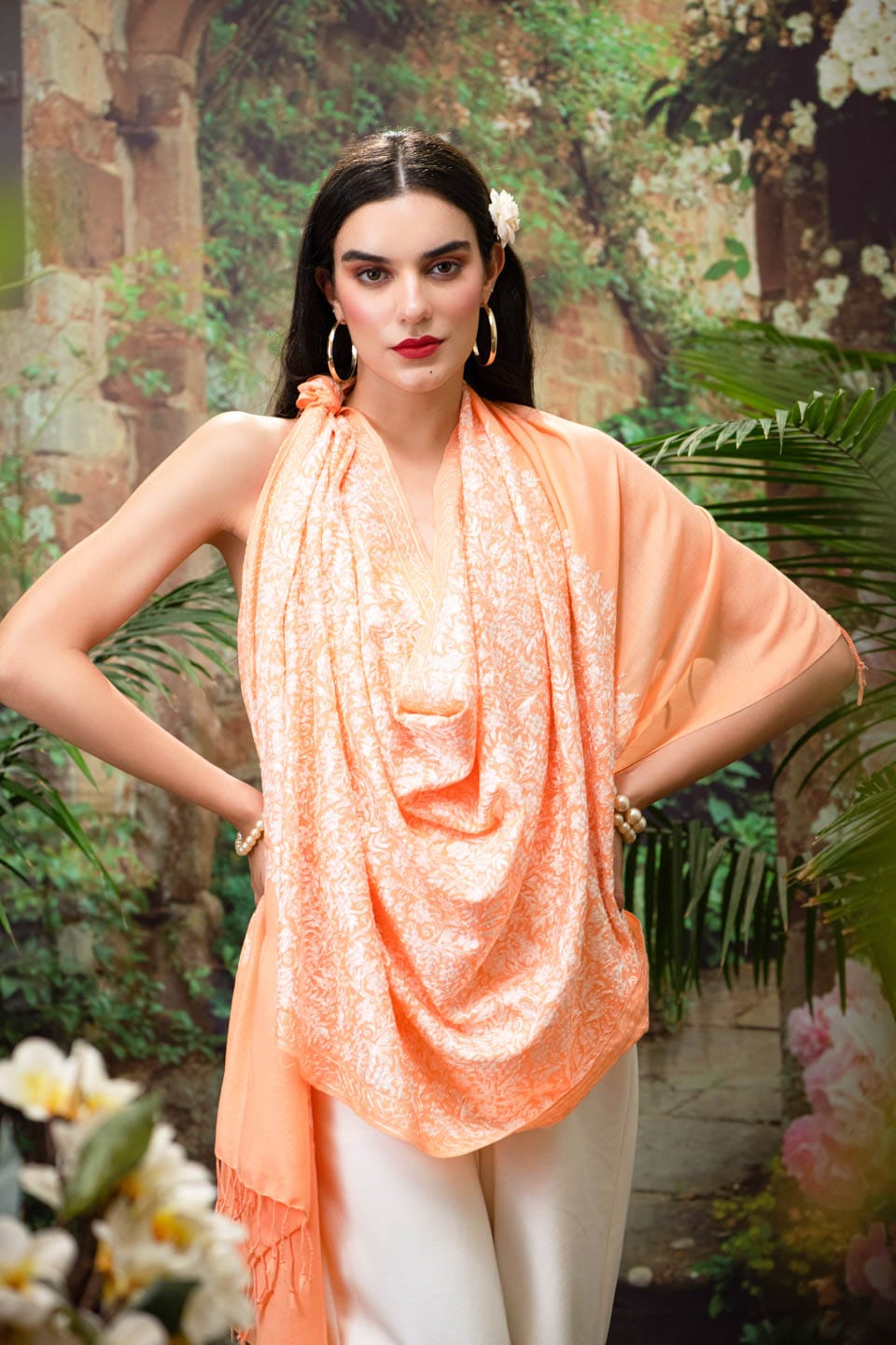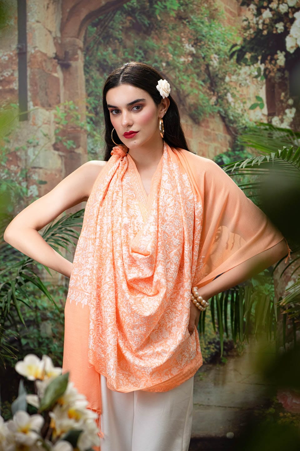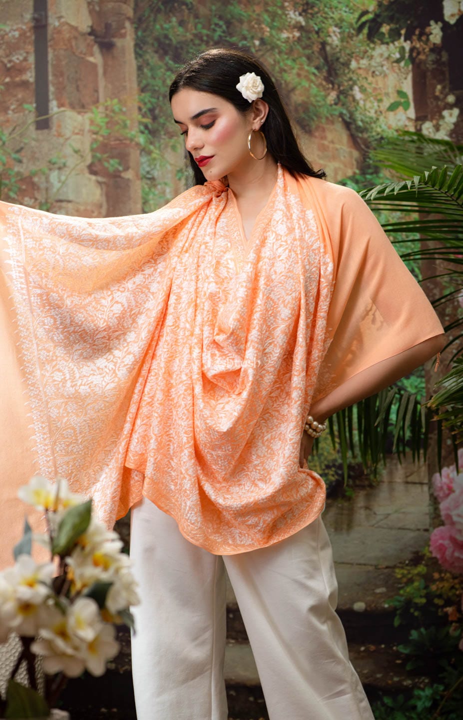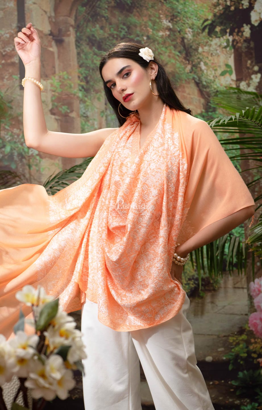 Pashtush womens Extra Fine Wool stole, Nalki embroidery design, Peach
