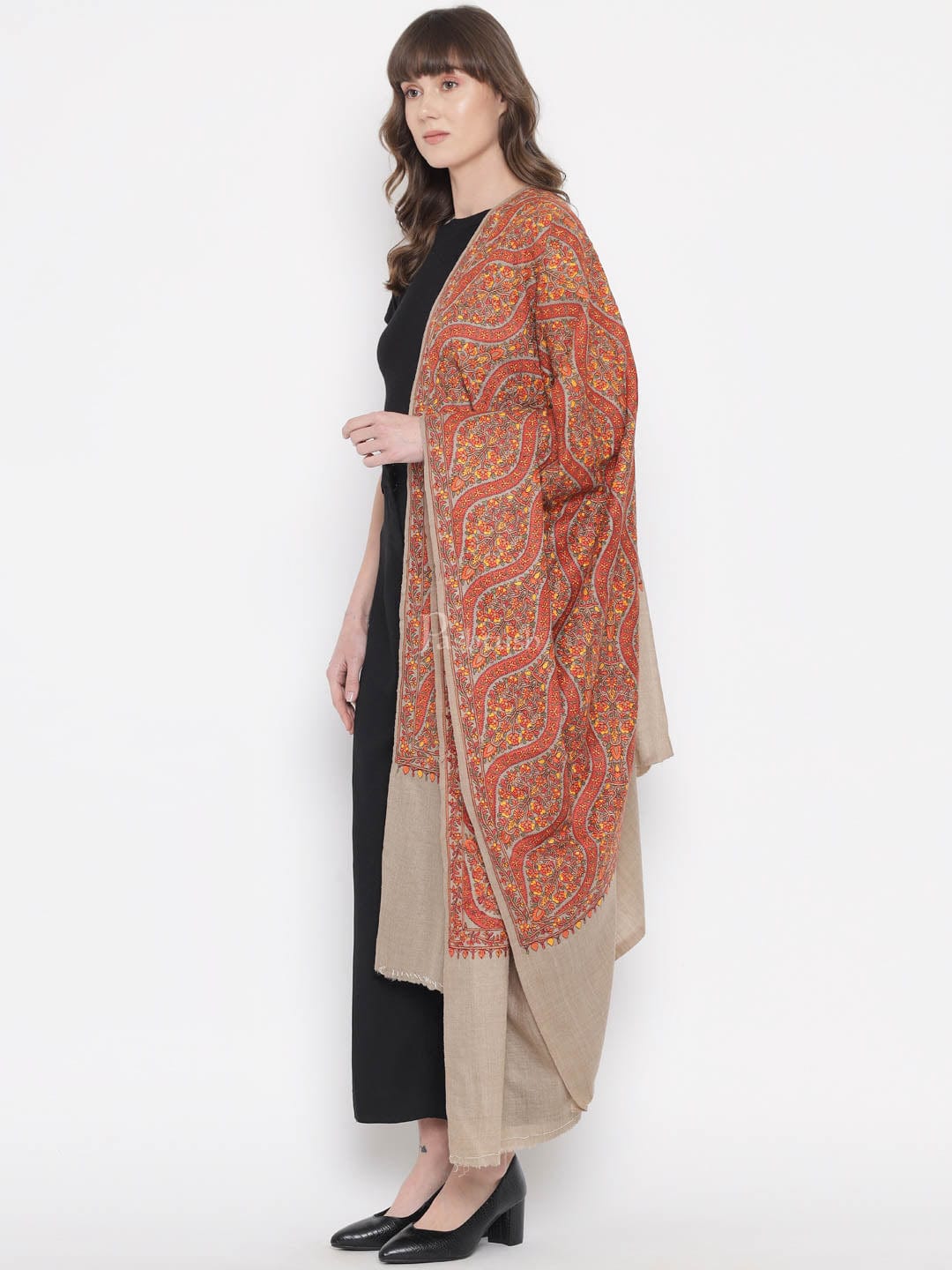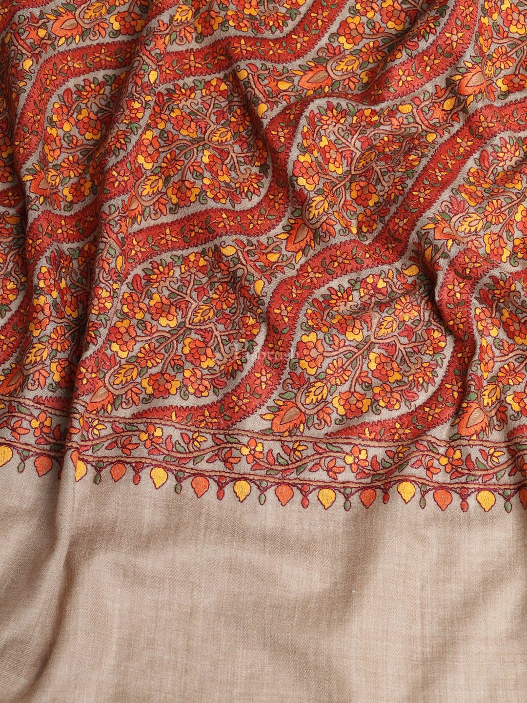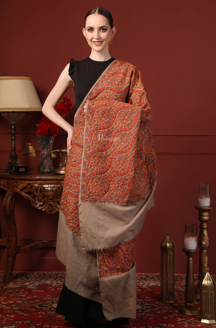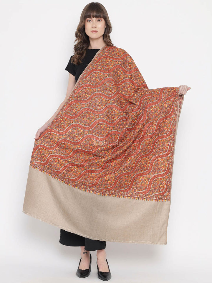 Pashtush Womens Shawl, Fine Wool, Needlework Jaal, Papier Mache Embroidery, Beige