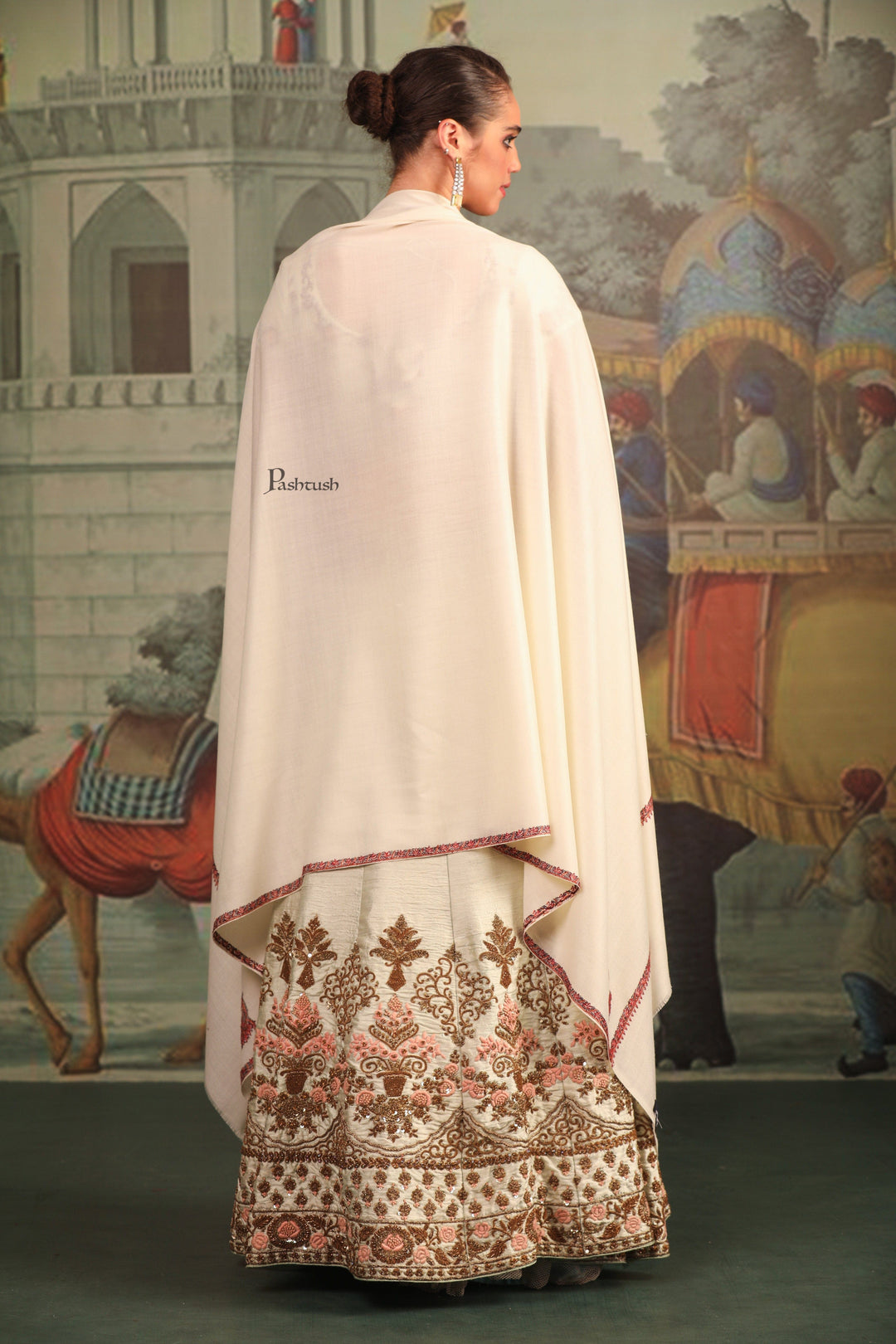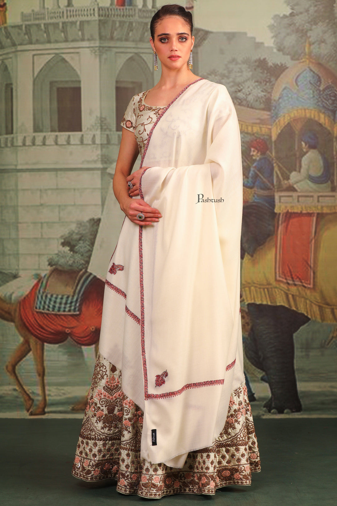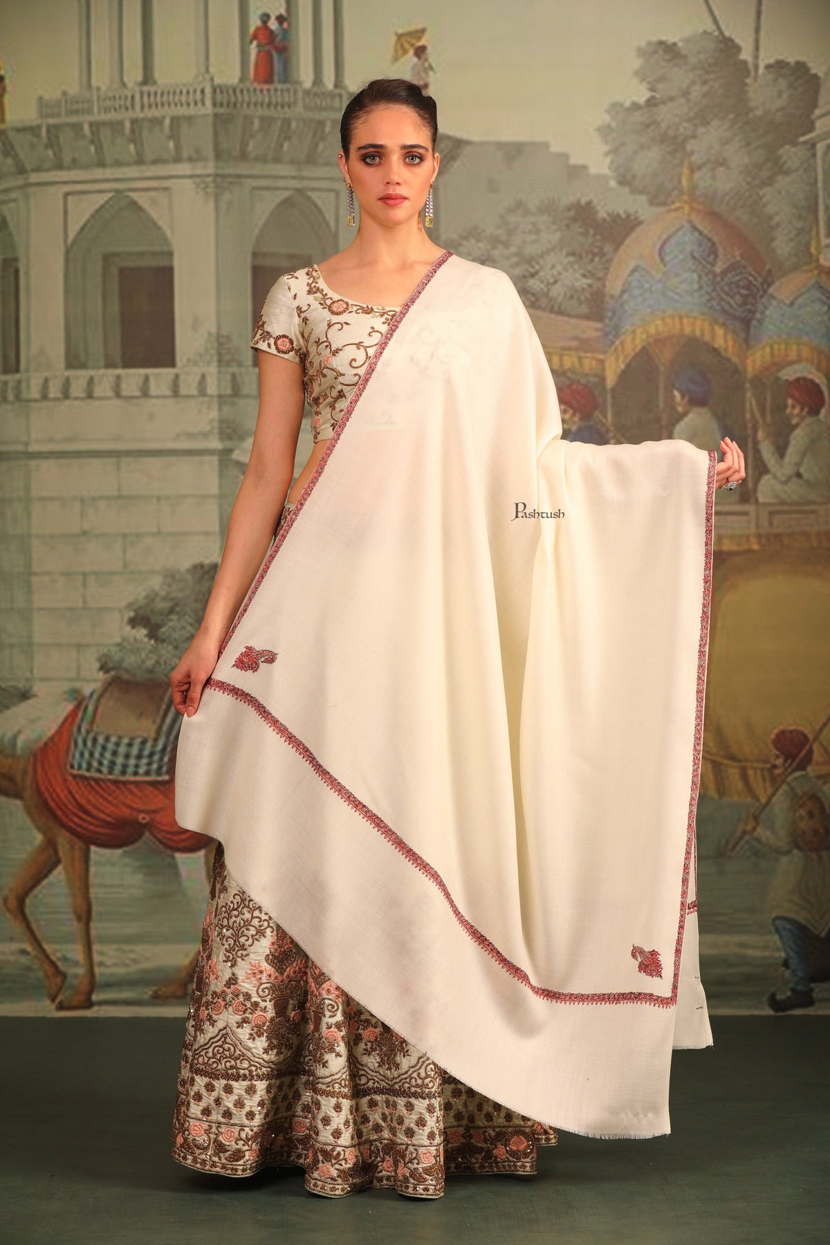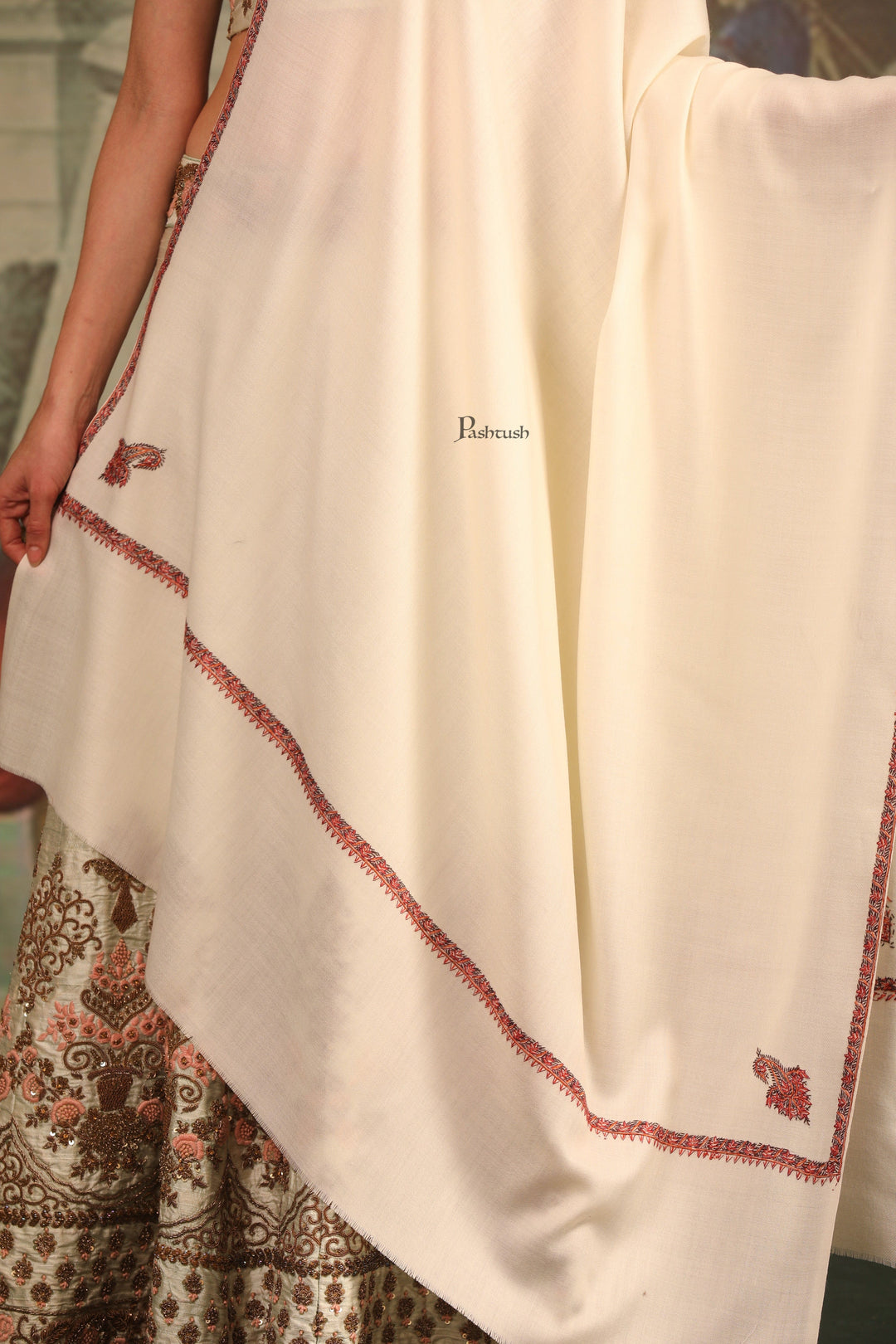Pashtush Womens Fine Wool Shawl, Kashmiri Hand Embroidered Kingri Design, Ivory