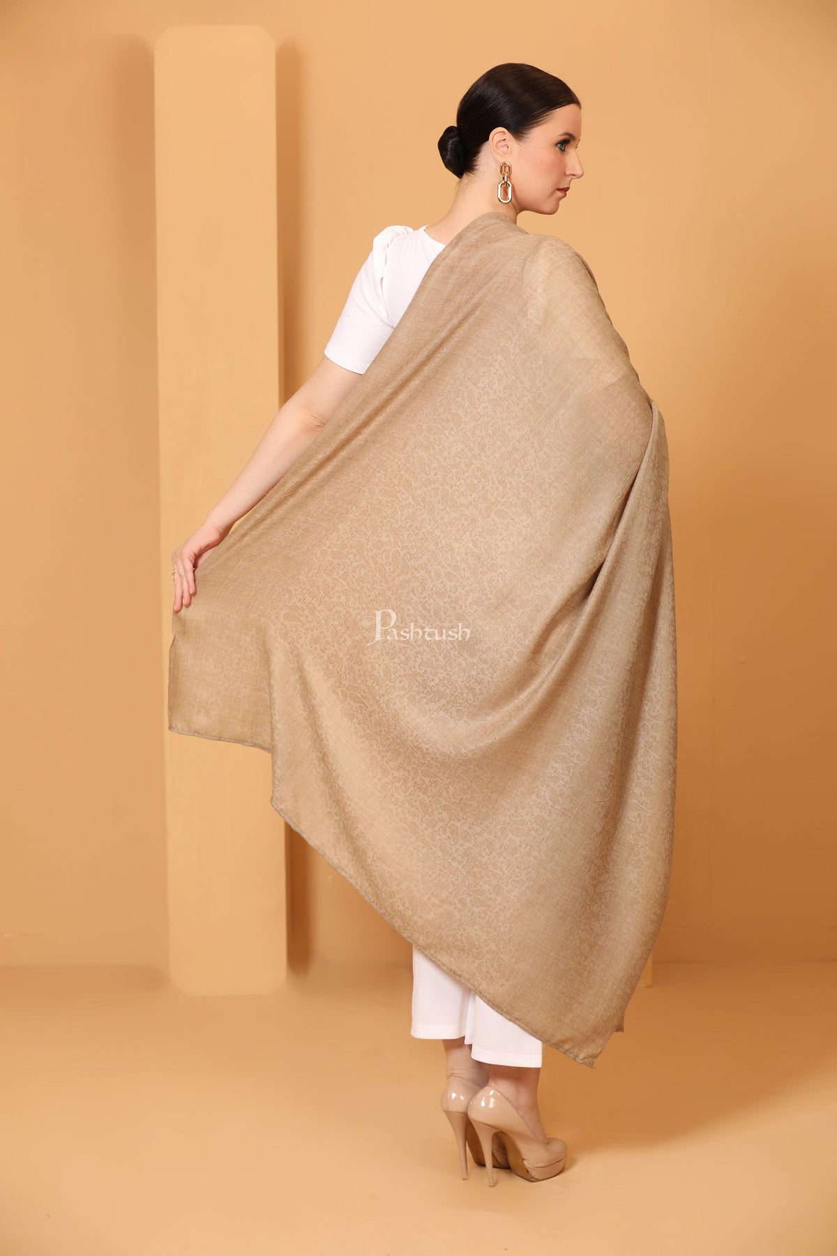 Pashtush Womens Fine Wool Shawl, Self Paisley Weave, Extra Soft, Warm and Light, Natural Beige