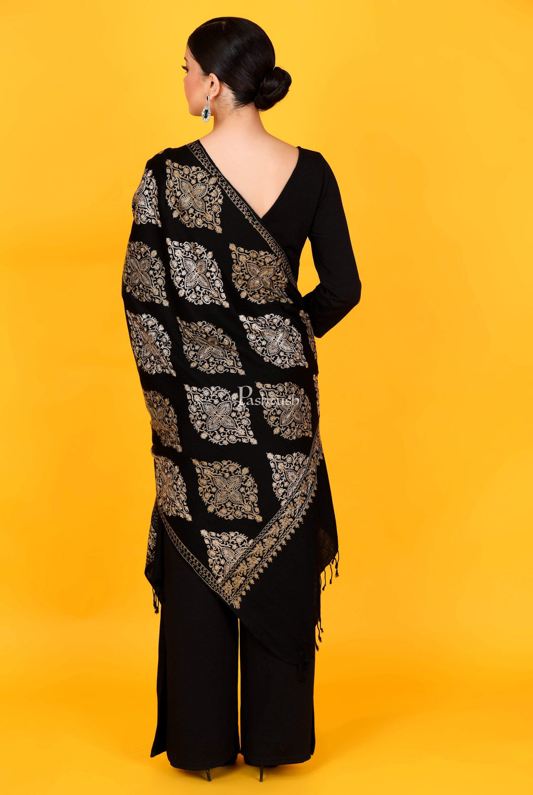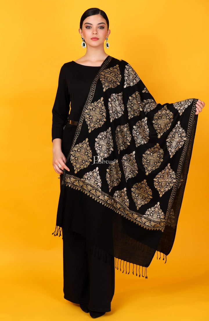 Pashtush Womens Fine Wool, Silky Nalki Embroidery Needlework Stole, Black