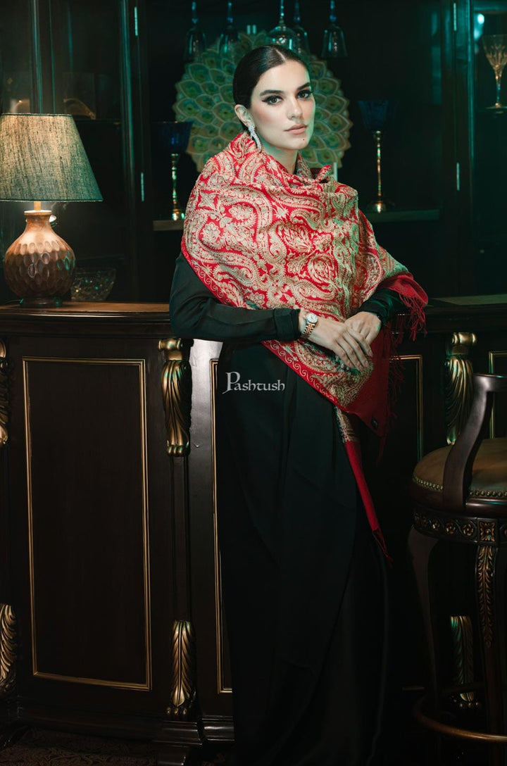 Pashtush womens Fine Wool Stole, nalki embroidery design, Red