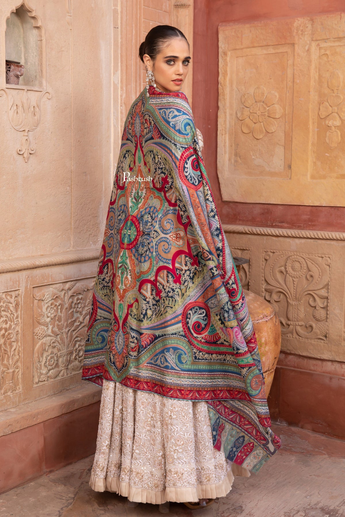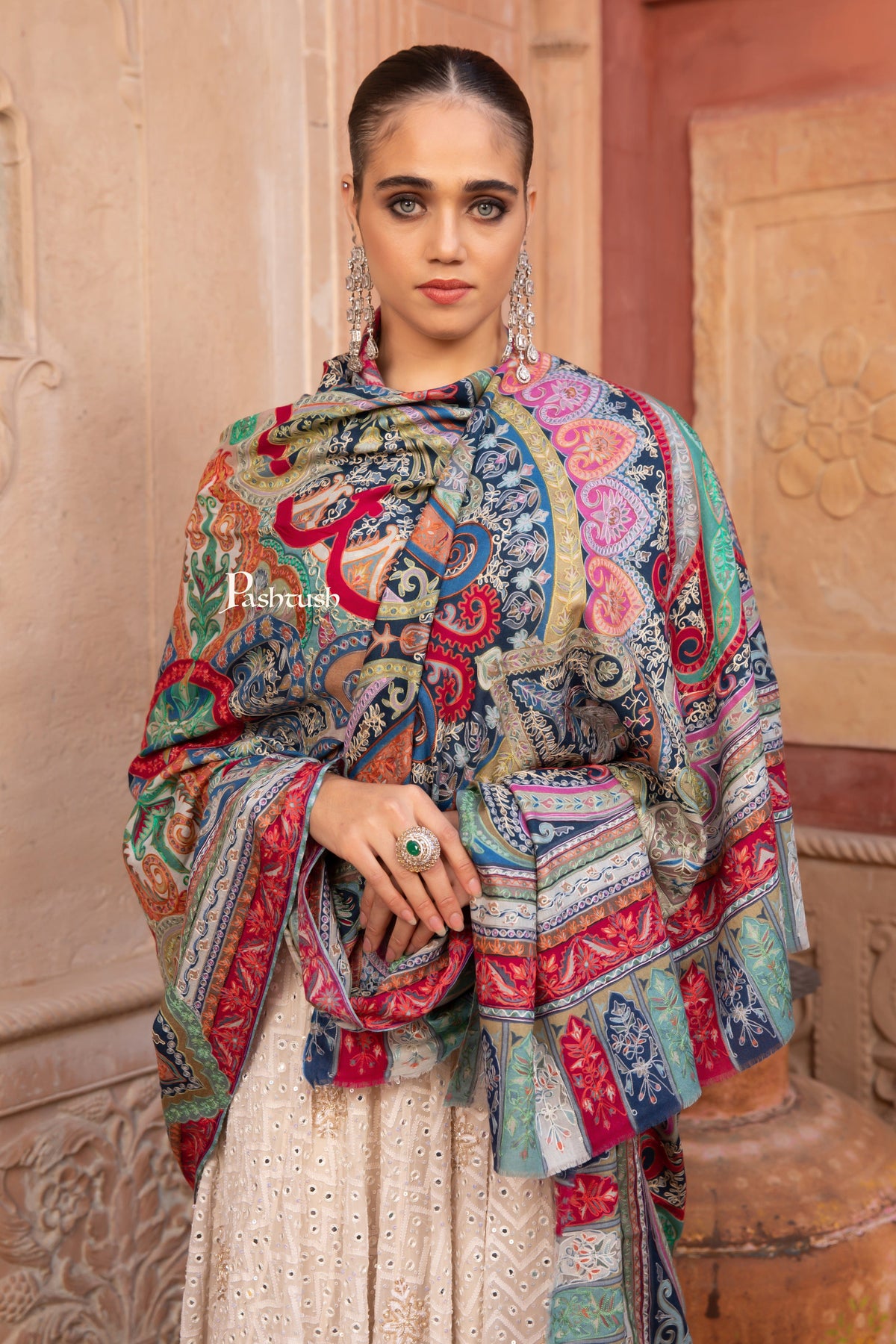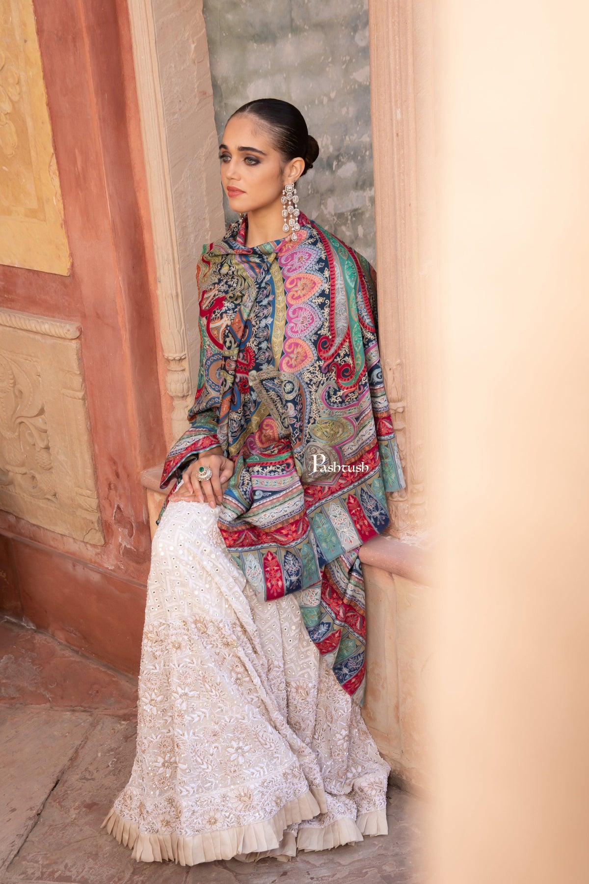 Pashtush India Womens Shawls Pashtush Womens Kalamkari Shawl with Hand Embroidered Outline Work, Fine Wool, Multicolour
