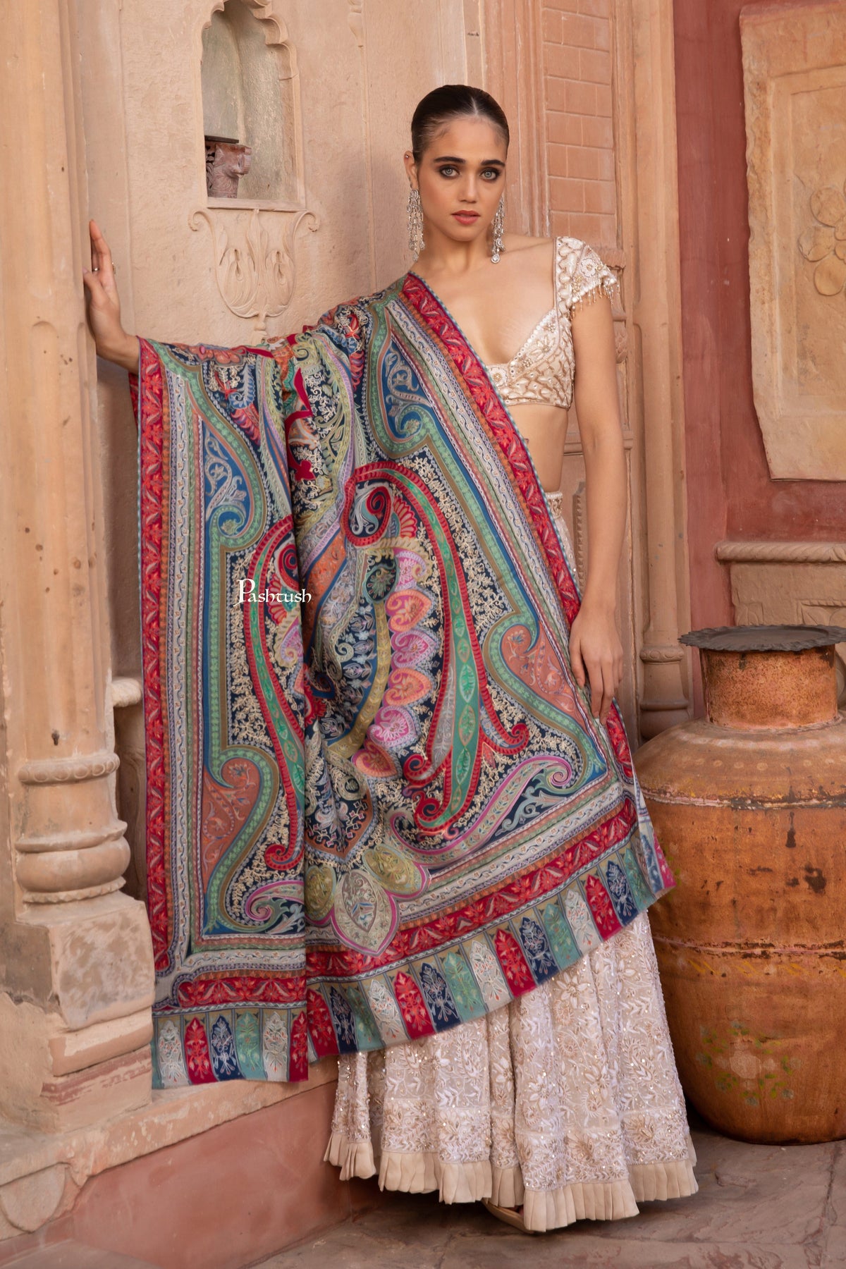 Pashtush Womens Kalamkari Shawl with Hand Embroidered Outline Work, Fine Wool, Multicolour