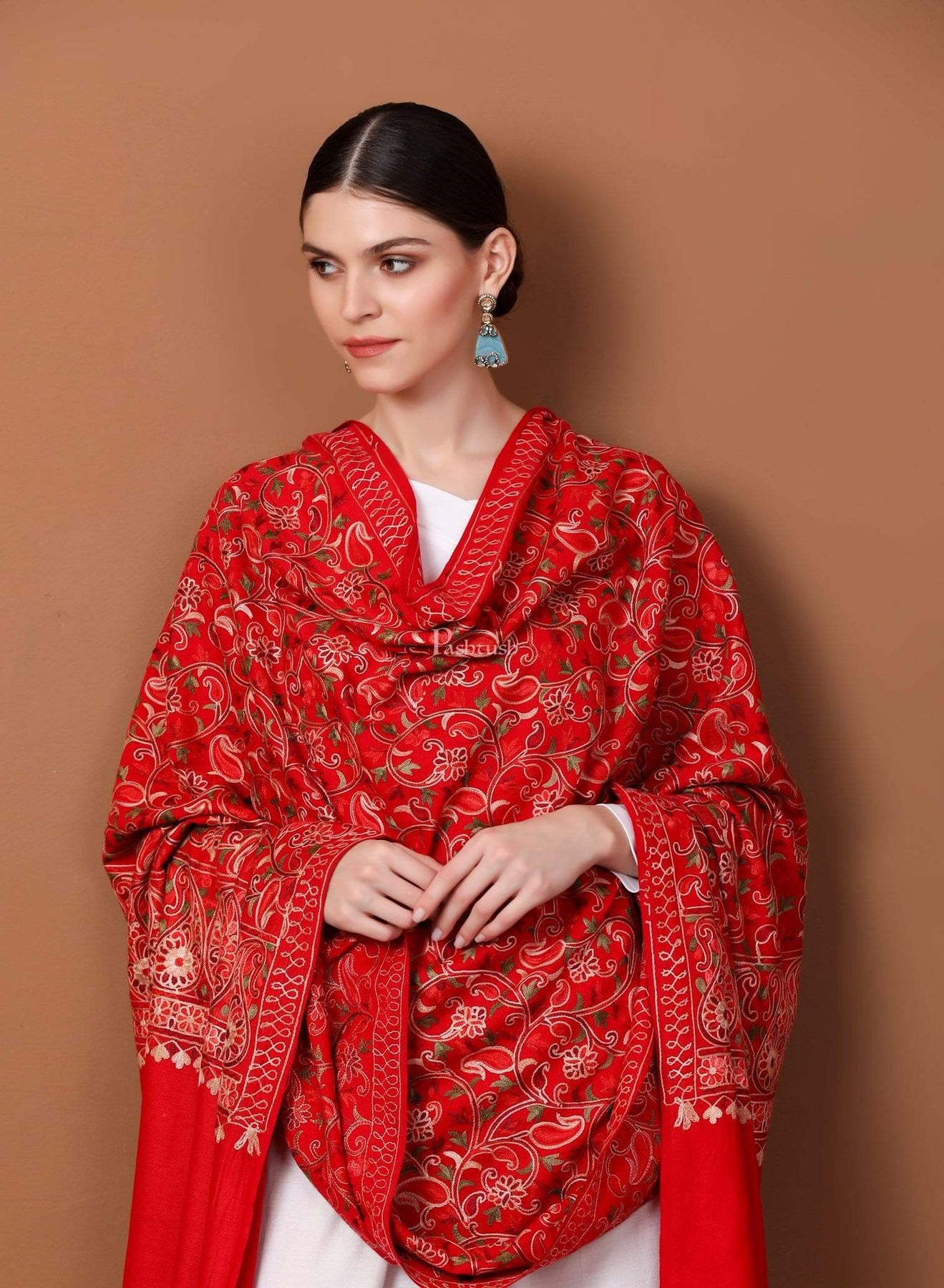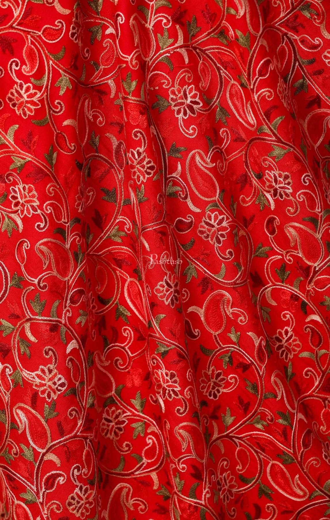 Pashtush Womens Shawl, Aari Embroidery, Ruby Red